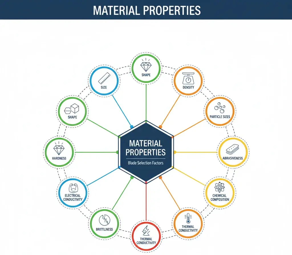 Tensile strength, hardness, density, and brittleness determine blade grit size, bond hardness, and feed rate selection. |