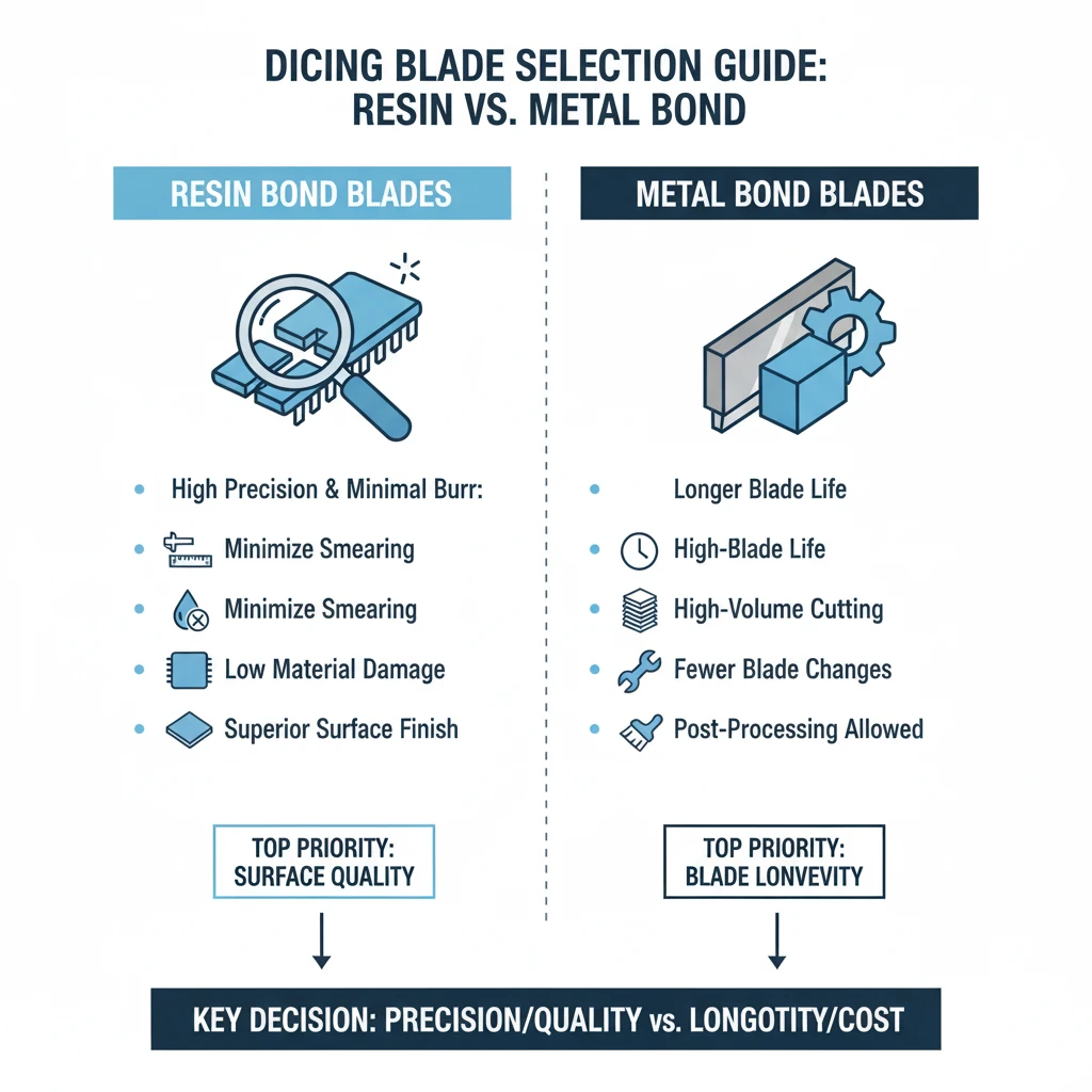 Ultimately, selecting the right blade depends on production priorities. If precision, minimal burr formation, and reduced post-processing are the main concerns, resin bond blades are the preferred choice. If extended blade life and minimal blade replacement are more critical, metal bond blades provide a cost-effective solution, though additional finishing steps may be required. By considering factors such as lubrication, cutting speed, feed rate, blade maintenance, cost analysis, and material composition, manufacturers can achieve the optimal balance between quality, efficiency, and longevity in QFN cutting operations.