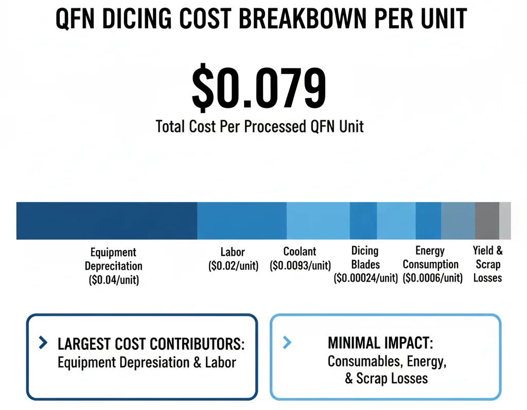 Consumables such as dicing blades ($0.00193/unit) and coolant ($0.0062/unit) have a relatively low impact on total cost.