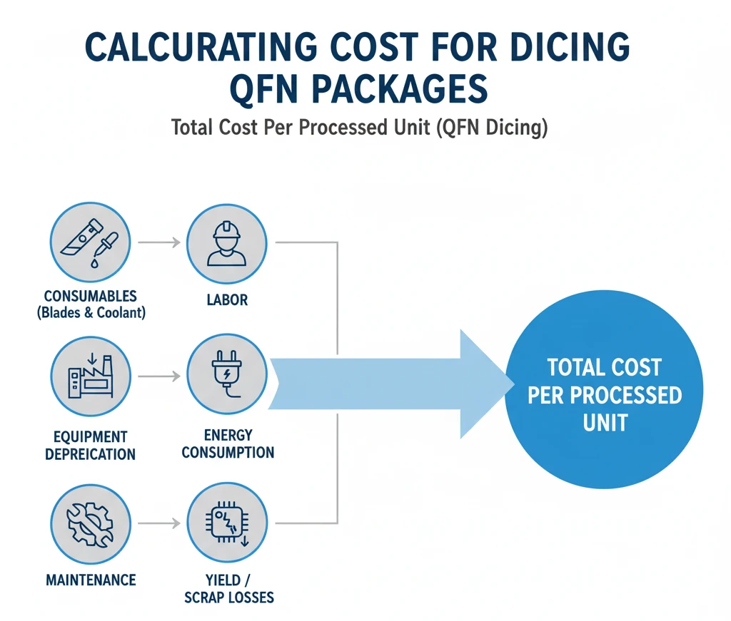 The Maintenance Cost calculation assumes an annual maintenance expense of $5,000 and a processing volume of 500,000 QFN units per year. This estimate includes routine servicing, blade dressing, and component replacements, but does not account for unexpected repairs, major equipment failures, or variations in maintenance frequency.