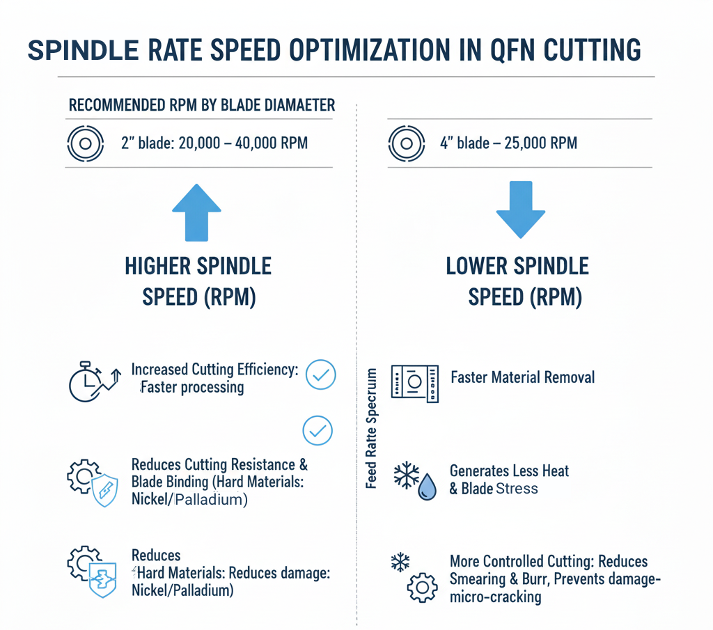 Higher spindle speeds improve cutting efficiency by increasing the number of cutting actions per second, leading to smoother cuts and faster processing. A high spindle speed is particularly advantageous when working with hard materials such as nickel-palladium coatings, as it reduces cutting resistance and prevents blade binding. However, excessive spindle speeds can generate excess heat, which may cause thermal damage to sensitive materials, leading to micro-cracking or warping of the QFN package.