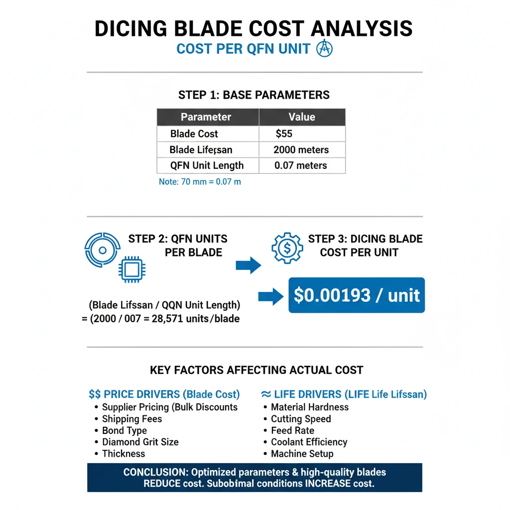 Users should verify their actual blade life and procurement costs to adjust the calculation for a more accurate cost-per-unit estimate based on their specific dicing process and material conditions.