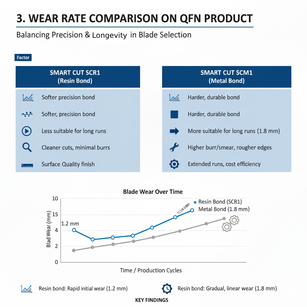 When selecting the right dicing blade for cutting QFN (Quad Flat No-Lead) products, understanding key performance metrics such as burr formation, smearing, and wear rate is essential. The following analysis is based on the performance of resin bond and metal bond blades, highlighting their advantages and limitations based on measured results.
