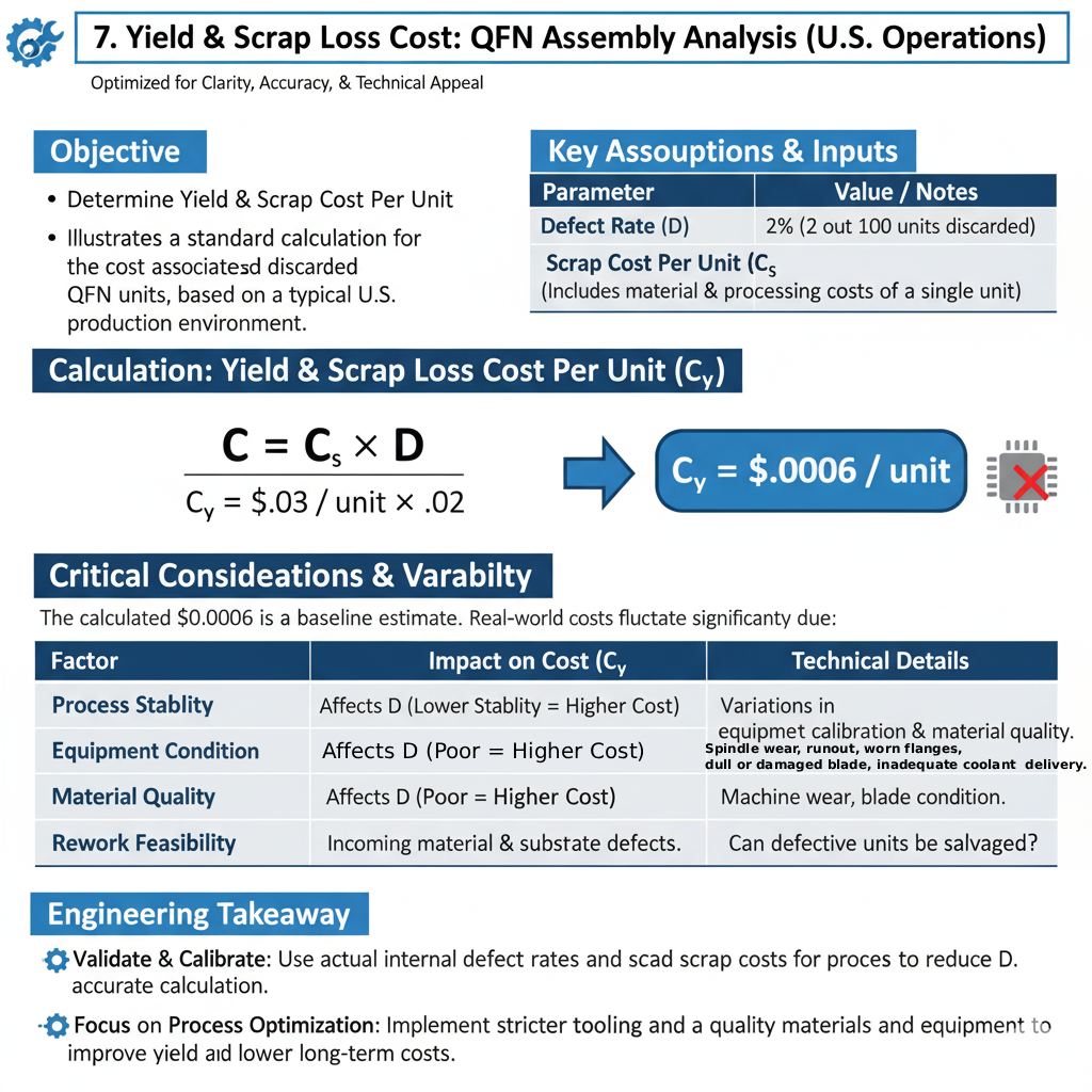 A 2% defect rate means 2 out of every 100 QFN units are discarded. If the scrap cost per unit is $0.03,