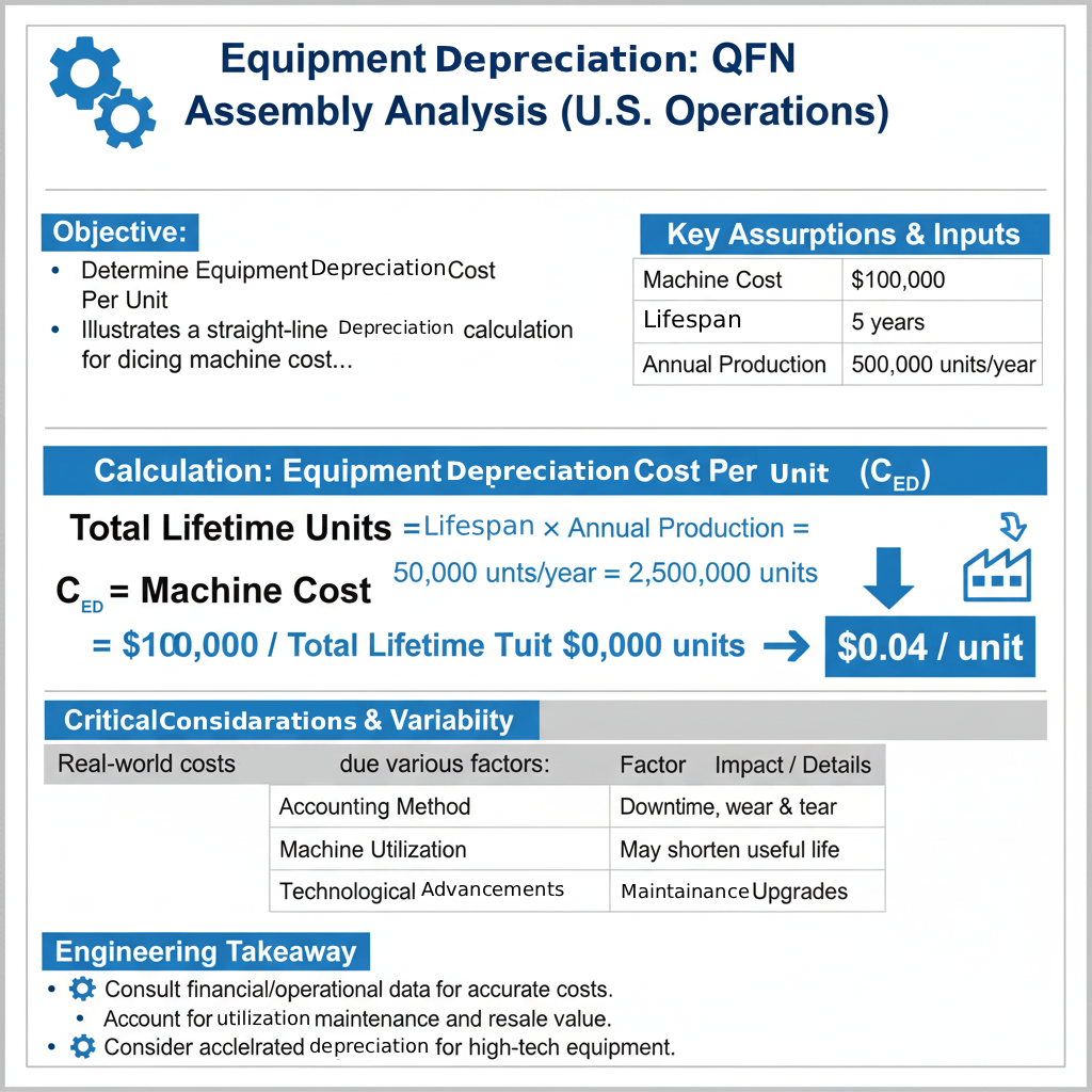 The Equipment Depreciation calculation assumes a dicing machine cost of $100,000 and an estimated lifespan of 5 years, processing 500,000 QFN units per year. These values are based on straight-line depreciation and do not account for factors such as resale value, machine efficiency degradation over time, or potential upgrades and maintenance costs.