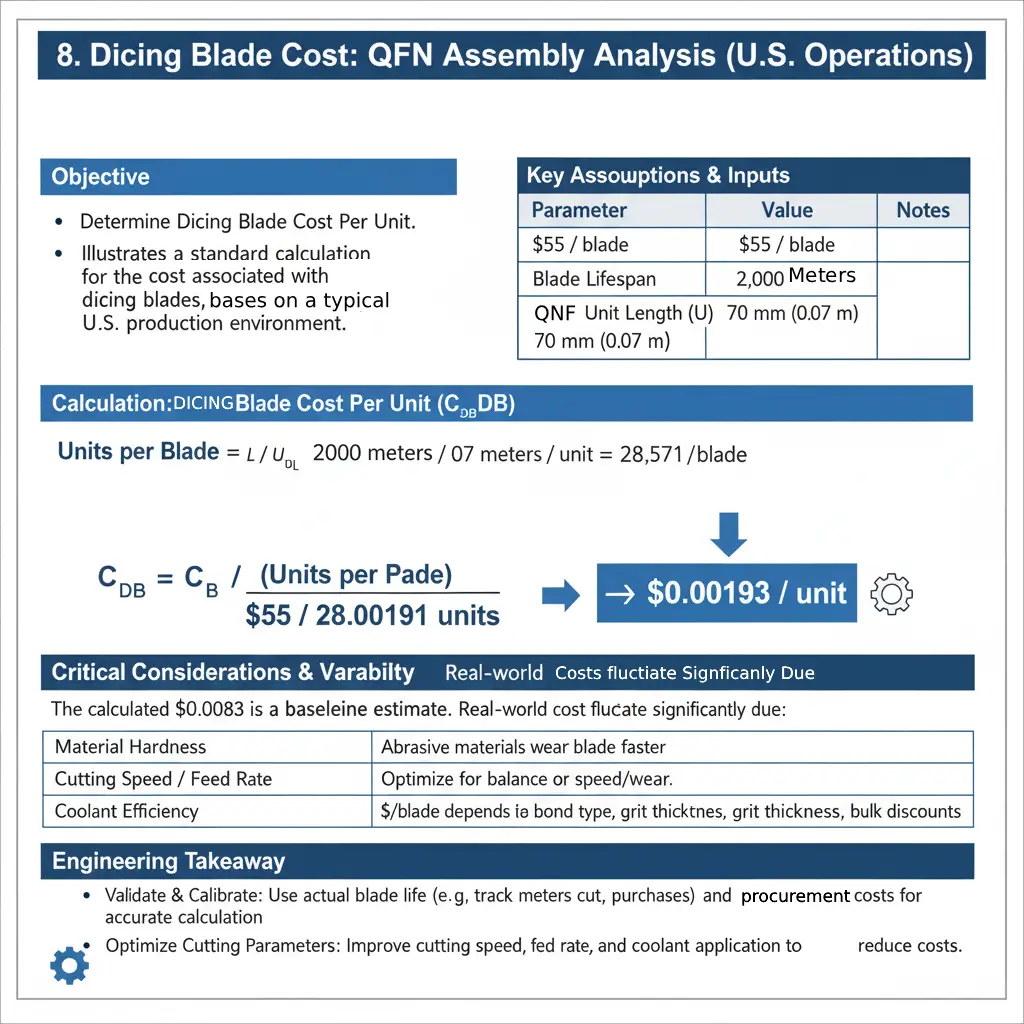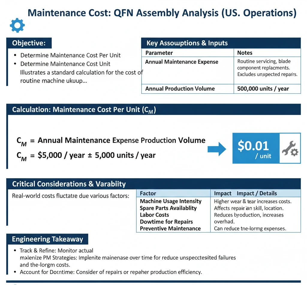 The Maintenance Cost calculation assumes an annual maintenance expense of $5,000 and a processing volume of 500,000 QFN units per year. This estimate includes routine servicing, blade dressing, and component replacements, but does not account for unexpected repairs, major equipment failures, or variations in maintenance frequency.