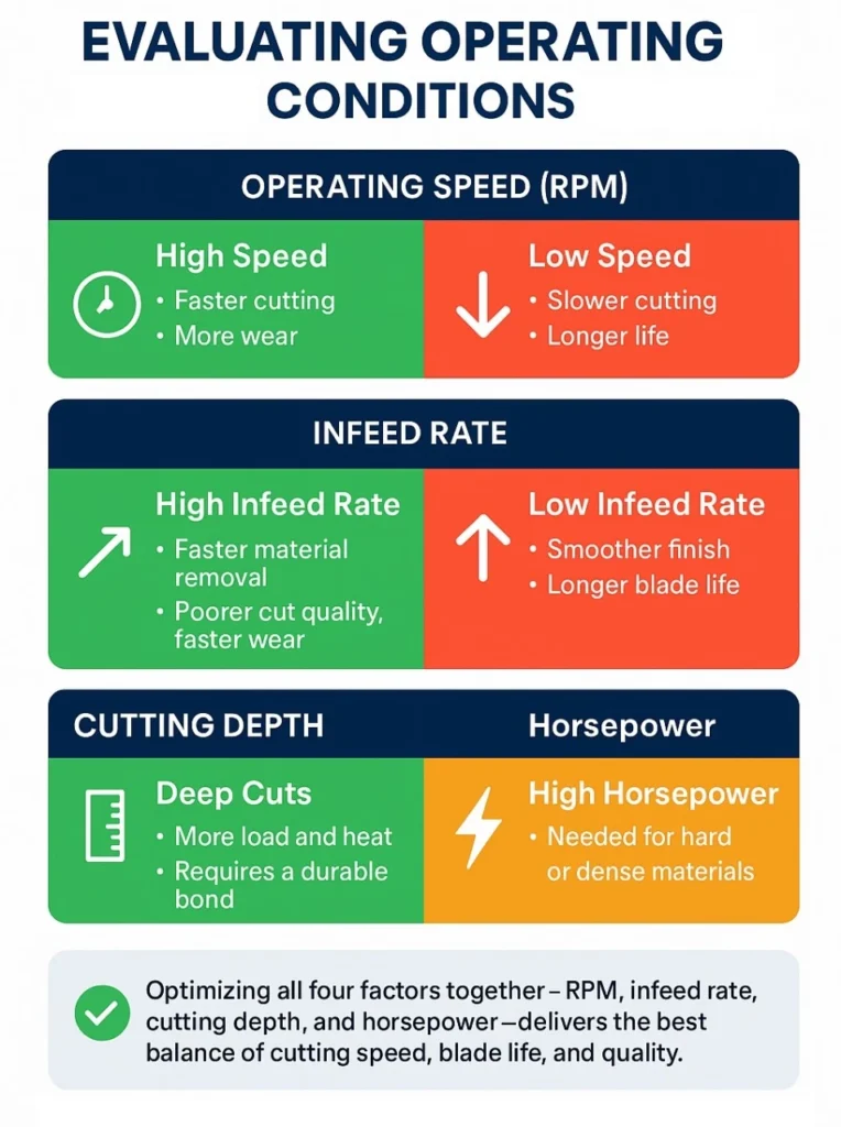 The second step in the blade selection process is to consider the effects of operating conditions on the diamond blade. Table 3 shows these anticipated effects.