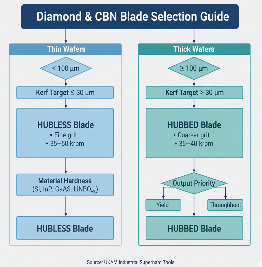 For wafers below 100 microns with kerfs of 12 to 25 microns, hubless blades with fine diamond grit (2–4 µm) provide the lowest cutting forces and best edge quality, particularly for brittle materials such as GaAs, InP, and LiNbO₃. For wafers between 100 and 200 microns with kerfs of 20 to 30 microns, hubless blades remain the preferred choice due to their low-force cutting and precision. Once wafers reach 200 to 500 microns and kerfs of 30 to 50 microns, hubbed blades often become the better option because they provide the stability needed at higher spindle speeds and faster feed rates. For wafers above 500 microns or with kerfs wider than 40 microns, hubbed blades are strongly recommended, since they handle greater cutting forces, provide longer life, and perform well in heavy-duty applications such as SiC.