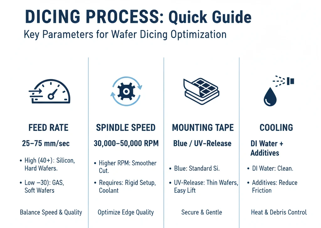 This article provides a practical guide to semiconductor wafer dicing. It covers the characteristics of the most common wafer materials, recommended blade types, critical process parameters, and common challenges such as chipping, heat buildup, and kerf width control. The goal is to equip engineers and process technicians with the knowledge needed to make informed decisions, improve wafer yields, and extend blade life in demanding production environments.