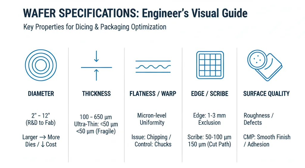 Wafer surfaces must meet strict specifications for roughness and defect density. Back-grinded or polished wafers require controlled surface roughness to maintain adhesion to mounting tape while preventing stress concentration points. Poor surface quality leads to higher breakage rates during dicing and reduced device reliability.
