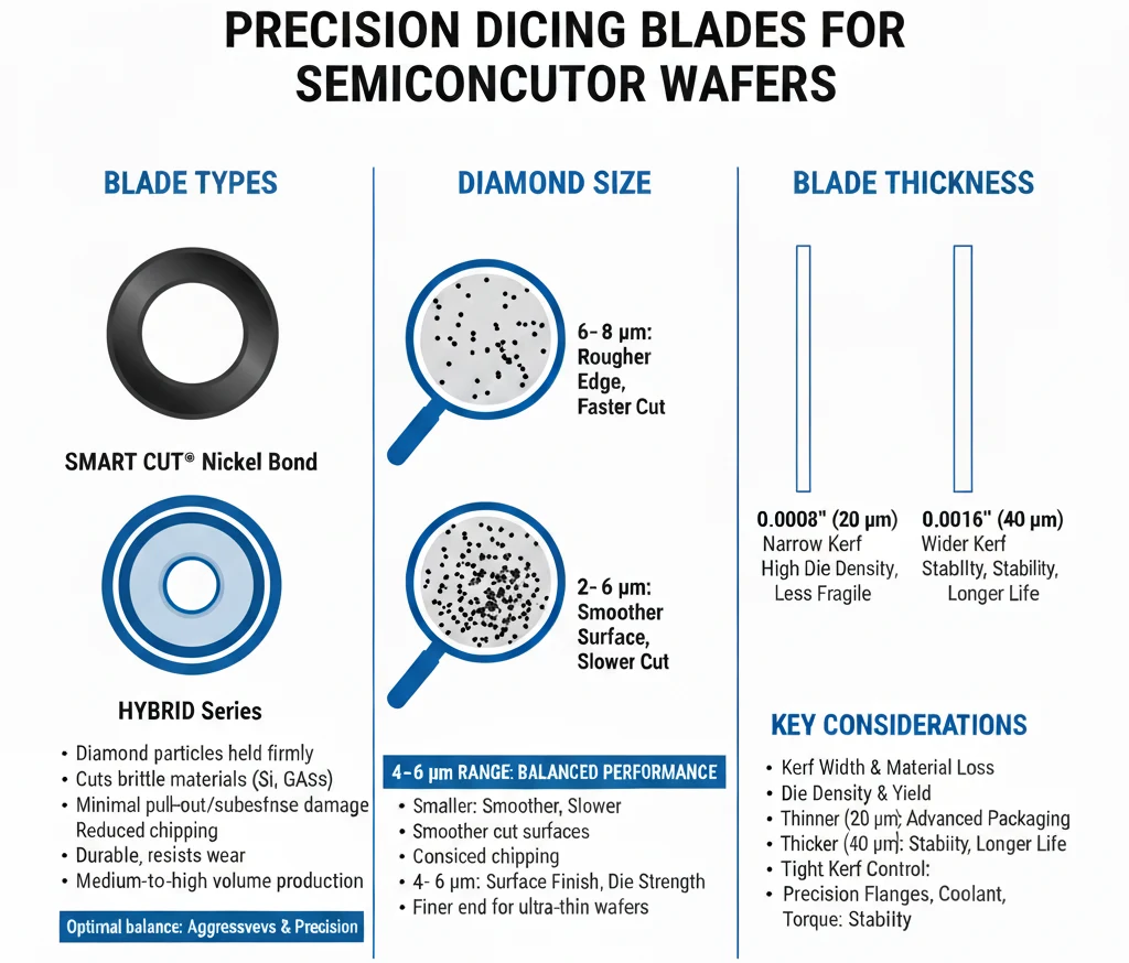In semiconductor wafer dicing, the choice between hubless and hubbed blades depends on wafer thickness, kerf requirements, and desired output.