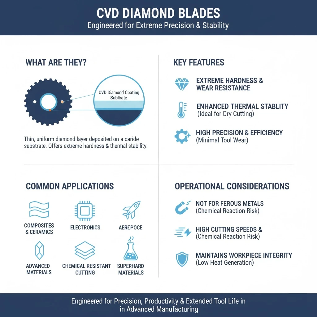 CVD diamond blades are prized for their ability to perform precise, high-performance cutting on a wide range of materials, including non-ferrous metals, composites, ceramics, and various superhard materials. The thin diamond coating allows for high cutting speeds and minimal tool wear, making CVD diamond blades ideal for applications requiring a high degree of accuracy and efficiency. They are commonly used in industries such as aerospace, electronics, and advanced manufacturing, where cutting-edge precision is critical.