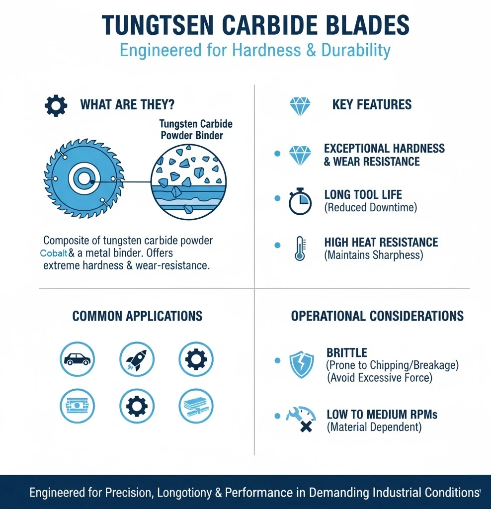 Tungsten carbide blades are particularly effective in cutting applications involving metals, composites, and other dense materials. Their high hardness allows them to maintain a sharp edge for extended periods, even under high-stress conditions. This makes them ideal for use in industries such as automotive, aerospace, and manufacturing, where precision and longevity are crucial.
