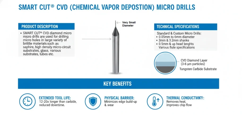Custom-engineered configurations are available upon request, including modifications in flute design, coating thickness, diamond particle size, and substrate composition to match specific materials, feed conditions, and cutting environments. Through the combination of uniform CVD diamond coating, precision-ground carbide substrate, and advanced tool manufacturing, SMART CUT® CVD Diamond Micro Drills deliver superior durability, precision, and productivity for the most demanding material processing applications.