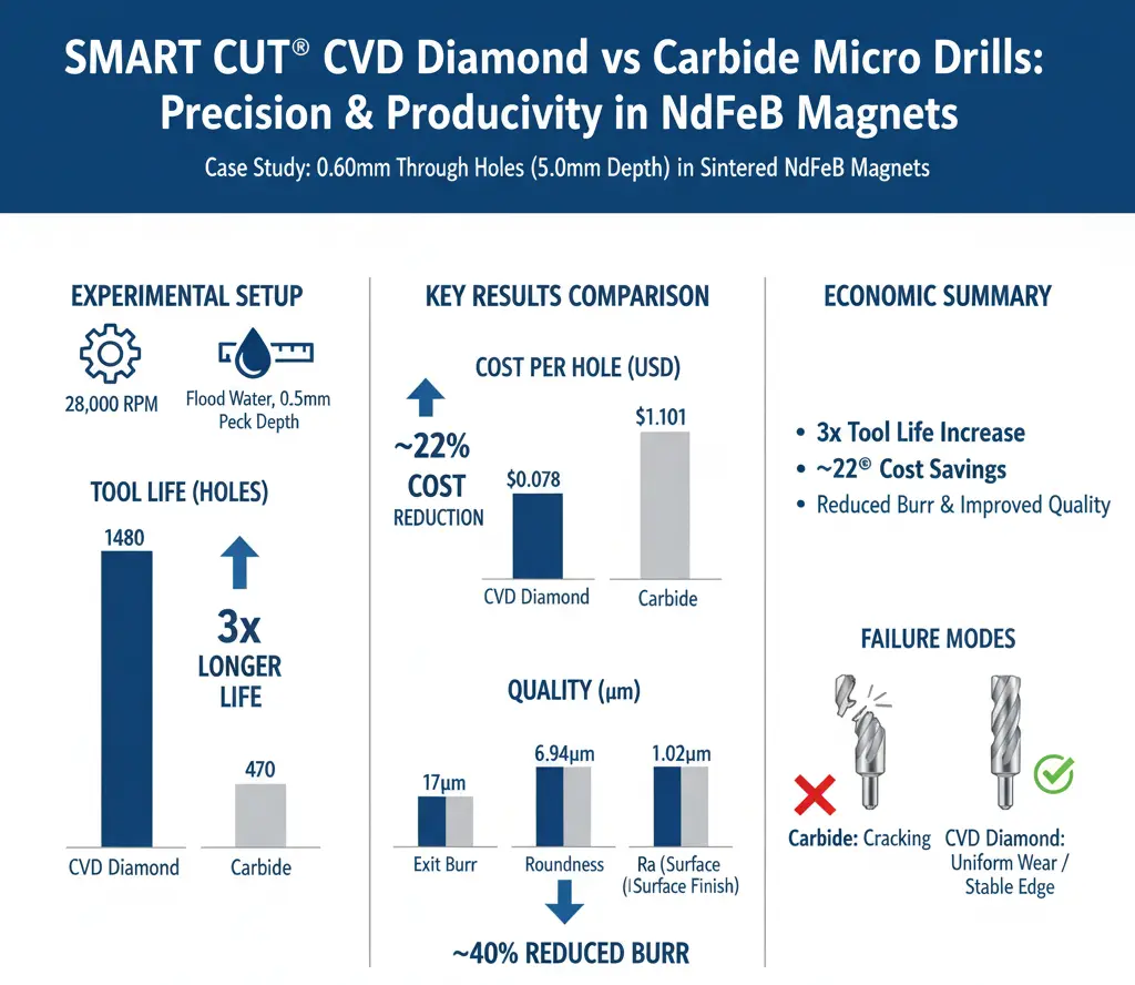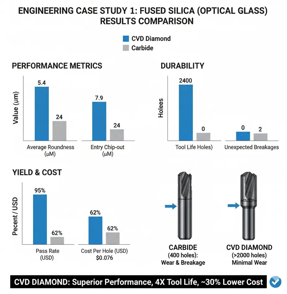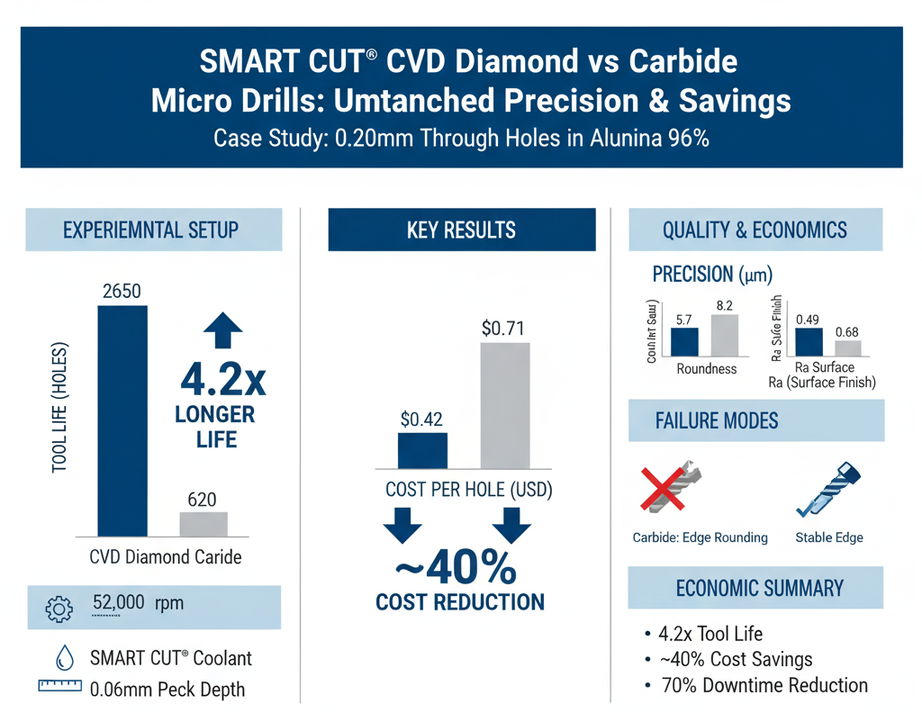 CVD reduced burrs by 33 %, extended life 2.4×, and reduced cost per hole by 18 %.