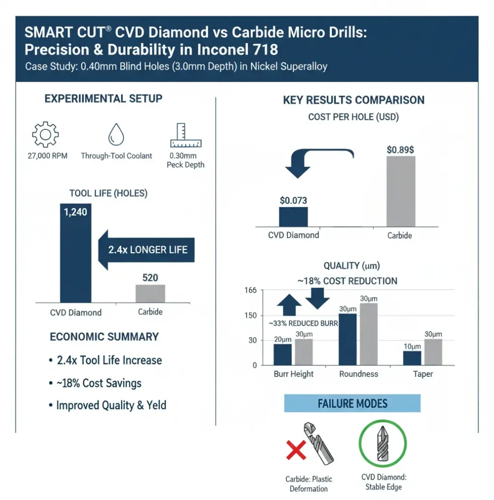 CVD diamond drills proved reliable for superalloys requiring high dimensional accuracy. Lower heat and friction enabled longer stable drilling without edge failure.