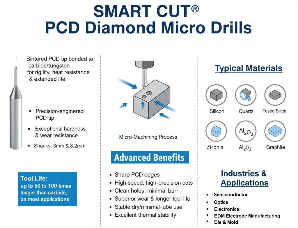 SMART CUT® 010DME Diamond Micro Drills represent a major advancement in precision micro-machining technology, specifically engineered to meet the challenges of drilling hard, brittle, and high-tech materials used across industries such as semiconductor, optics, advanced ceramics, aerospace, and medical device manufacturing.