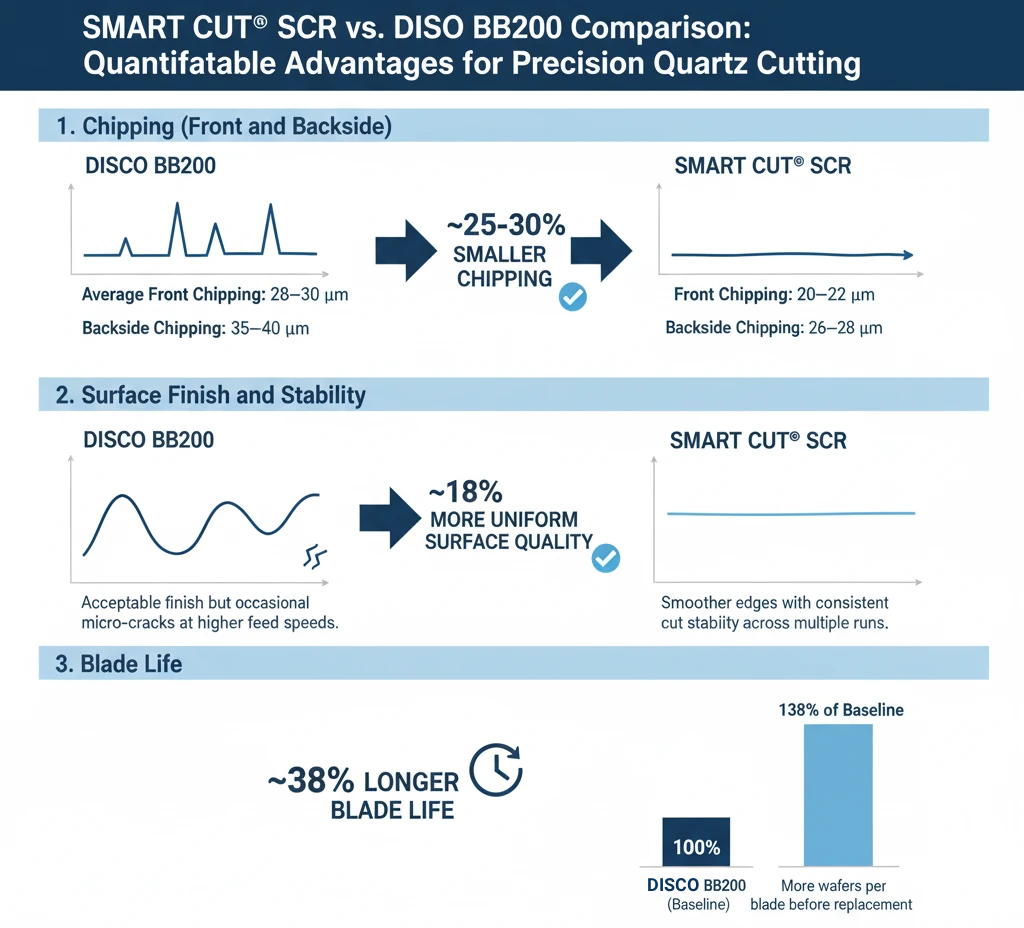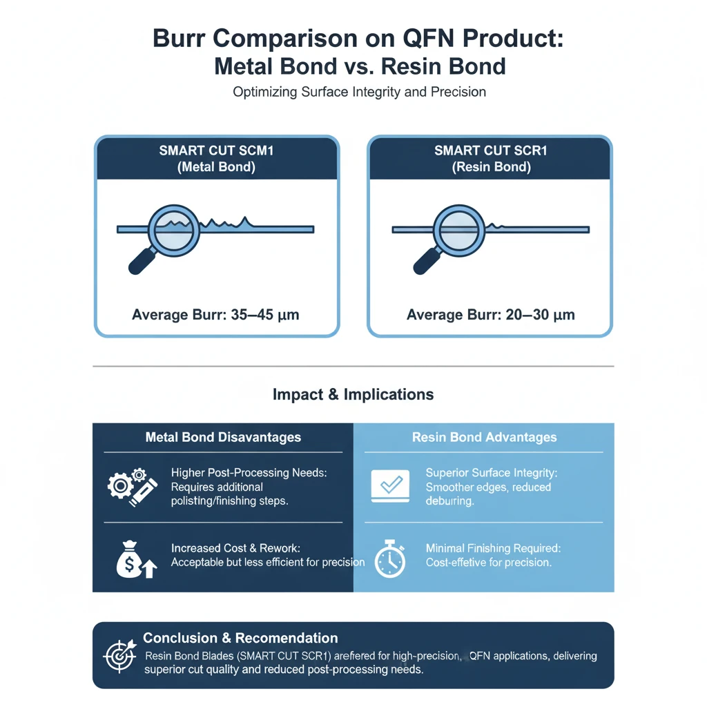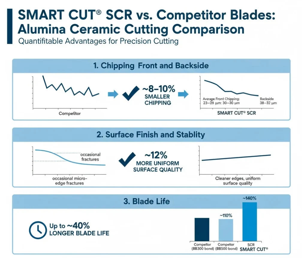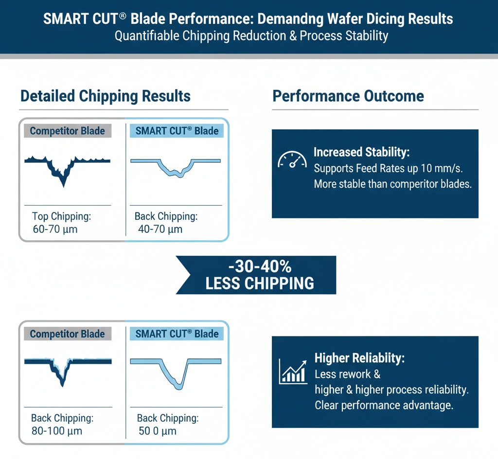 In advanced electronics manufacturing, resin bond dicing blades are widely used for cutting QFN, DFN, BGA, PCB, and glass substrates. Customers often face challenges with tool life, burr formation, tin melting, and chipping when using competitor blades. To evaluate performance differences, SMART CUT® SCR1 resin bond blades were tested head-to-head against competitor resin bond blades under identical operating conditions. SMART CUT® SCR1 resin bond blades delivered 2–3 times longer blade life, cleaner cuts with fewer burrs, and greater reliability compared to competitor blades. By reducing downtime for blade changes and minimizing defective parts, customers achieved lower overall dicing costs and higher production yields. Factor SMART CUT SCm1 (Metal Bond) SMART CUT SCR1 (Resin Bond) Average Burr Level 35–45 microns 20–30 microns Consistency Over Blade Life High burr levels remain steady Low burr levels remain consistent Surface Integrity Rougher surface, prone to defects Smoother surface with better edge quality Post-Processing Needs Requires polishing or secondary finishing Minimal or no finishing required Suitability for QFN Products Acceptable but increases cost and rework Preferred choice for precision, minimal burr applications Factor SMART CUT SCm1 (Metal Bond) SMART CUT SCR1 (Resin Bond) Smearing Level 45–55 microns, fluctuating throughout blade life 25–35 microns, consistent through blade life Edge Definition Reduced sharpness, visible deformation along cut edge Superior edge definition with minimal material drag Impact on Dimensional Accuracy Greater risk of distortion, affecting bonding and assembly Maintains high accuracy with clean cut edges Cleaning/Rework Needs Often requires additional cleaning or rework Minimizes need for secondary processing Suitability for Precision Applications Less suitable due to excessive smearing Preferred for semiconductor dicing and advanced electronics packaging Factor SMART CUT SCR1 (Resin Bond) SMART CUT SCm1 (Metal Bond) Wear Rate Rapid initial wear, reaching 1.2 mm early in blade life Gradual, linear wear, reaching 1.8 mm at end of test Bond Structure Softer bond, designed for precision but shorter lifeHarder bond, designed for durability Harder bond, designed for durability Suitability for Long Production Runs Less suitable due to faster degradation More suitable thanks to slower wear rate Surface Quality Impact Produces cleaner cuts, minimal burrs and smearing Higher burr and smear rates, rougher edges Best Application Fit Ideal for precision, high-quality surface finish applications Ideal for extended production runs and cost efficiency Based on this analysis, the choice of blade should be dictated by the specific requirements of the application: If surface quality and precision are the top priority, resin bond blades are the superior choice for cutting QFN products. However, if blade longevity and wear resistance are more critical, metal bond blades provide a longer-lasting solution but at the cost of increased burr and smearing. Precision cutting of thin mirror glass requires a stable blade capable of producing minimal chipping. Customers in optics and display manufacturing often report excessive chipping when using competitor blades, leading to lower yields and added polishing costs. Compared to competitor resin bond blades, the SMART CUT® blade cut chipping by almost 40%, producing smoother edges and reducing polishing requirements. Customers achieved higher production yields and fewer rejects, making SMART CUT® the preferred choice for precision mirror glass cutting. Quartz and Lithium Niobate wafers are brittle crystalline materials used in photonics, semiconductors, and advanced electronics. Excessive chipping can damage the wafer surface and compromise downstream assembly. Competitor blades often struggle to balance cutting speed with acceptable edge quality. SMART CUT® resin bond blades maintained lower chipping levels while supporting feed rates up to 10 mm/s, proving more stable than competitor blades. With 30–40% less chipping, manufacturers saw less rework and higher overall process reliability. SMART CUT® blades provide a clear performance advantage for demanding wafer dicing operations. Borosilicate glass is widely used in displays, optics, and precision components due to its low thermal expansion and durability. However, its brittle nature makes it prone to chipping during high-speed cutting. DISCO’s BB101 bond blades are a common choice in this application. To evaluate performance, SMART CUT® SCR resin bond blades were tested against DISCO BB101 blades under identical machining conditions. The SMART CUT® SCR resin bond blade demonstrated measurable advantages over DISCO BB101 in borosilicate glass cutting: These incremental but meaningful improvements translate into higher yields, fewer blade changes, and lower cost per cut for glass processing operations. Quartz wafers are widely used in electronics, optics, and resonator applications due to their stability and hardness. However, their brittle nature makes them prone to chipping and surface damage during high-precision cutting. DISCO’s BB200 bond blades are commonly used for this application. To evaluate performance, SMART CUT® SCR resin bond blades were compared against DISCO BB200 under identical machining conditions. The SMART CUT® SCR resin bond blade demonstrated clear advantages over DISCO BB200 in quartz cutting: These improvements translate directly into higher production yields, reduced rework, and lower cost per cut. For quartz processing applications, SMART CUT® provides a superior balance of precision, efficiency, and durability compared to conventional alternatives. Alumina (Al₂O₃) ceramics are widely used in electronics, semiconductors, and medical devices due to their hardness, thermal resistance, and electrical insulation properties. Their brittleness, however, makes them prone to chipping and edge fractures during dicing. C