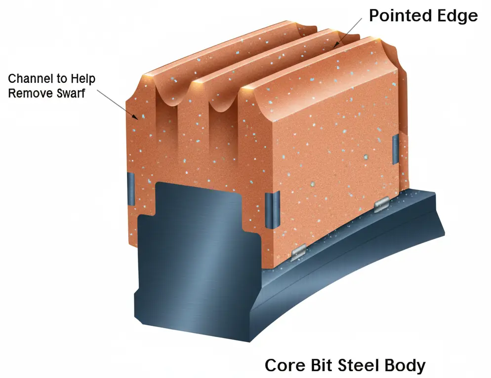 The double-pointed segments provide faster drilling speeds, reduced vibration, and improved cooling and slurry removal. They also help maintain a straight drilling path, reducing side drag and increasing drilling efficiency.