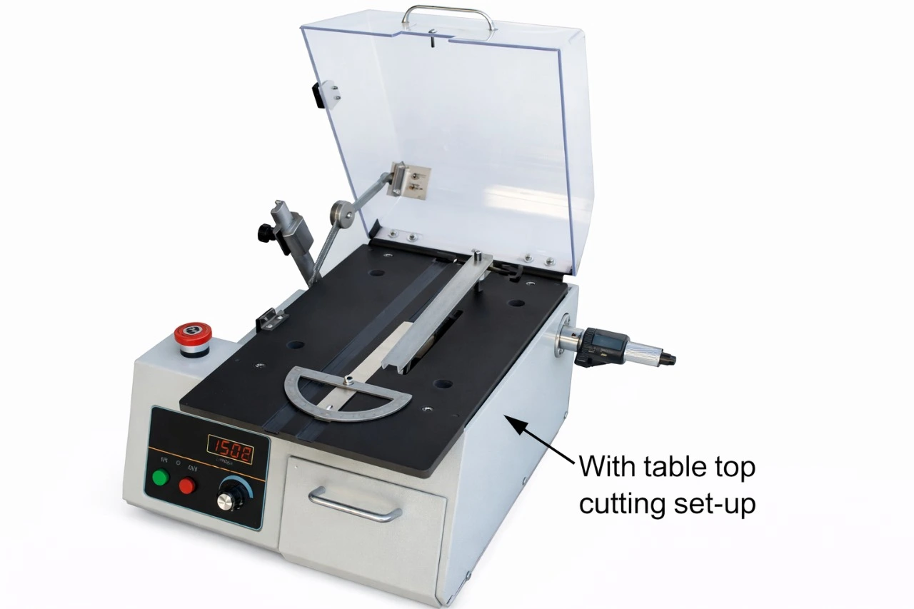 The machine comes with over 9 chucks/vices (work holding fixtures, table tope cutting set up for cutting flat samples such as pcb boards. The large variety of chucks, rpm’s range, and wafering blade specs available for this machine, makes one of the most universal and affordable cutting machines on the market.