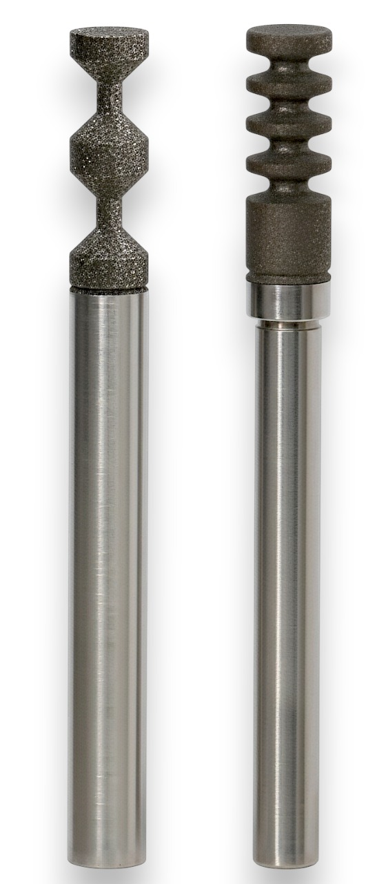 They have several layers of diamonds, held by a tough durable nickel alloy. Providing high diamond concentration, better diamond crystal retention and maximum diamond particle (grit) exposure/protrusion ratio. This provides freer, faster cutting action with minimum heat generation. Advantages of this type of technology include: longer tool life, more uniformity in performance, less stress to material being worked on, minimum material deformation, and better preservation of true material micro structure. This is specially important for more delicate, sensitive applications such as: glass, crystals, silicon wafers, carbon composites, sapphire, etc.