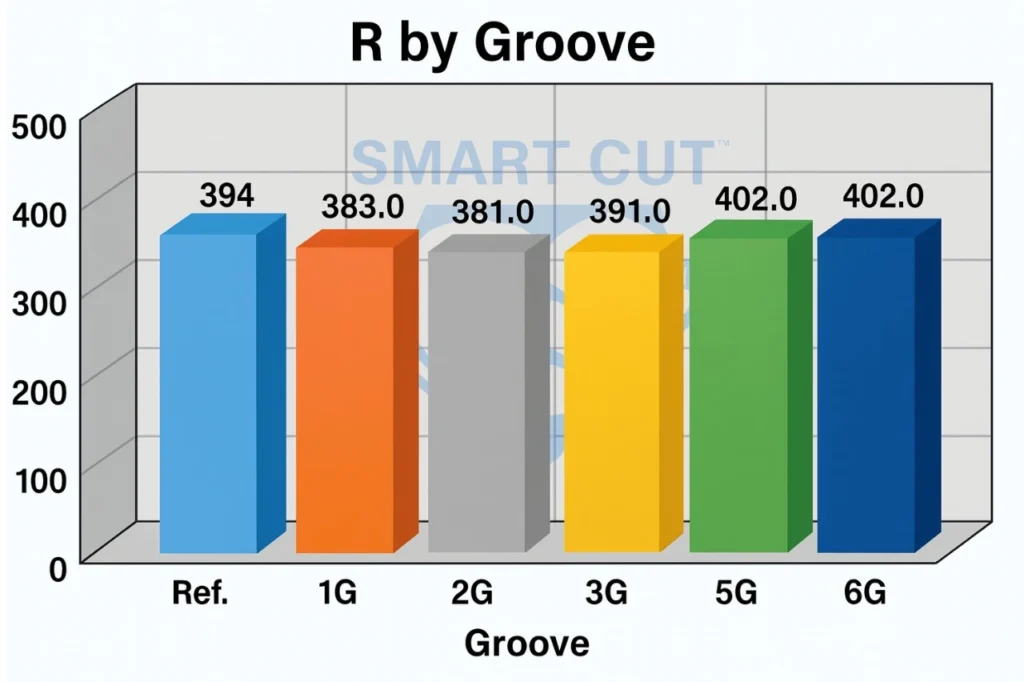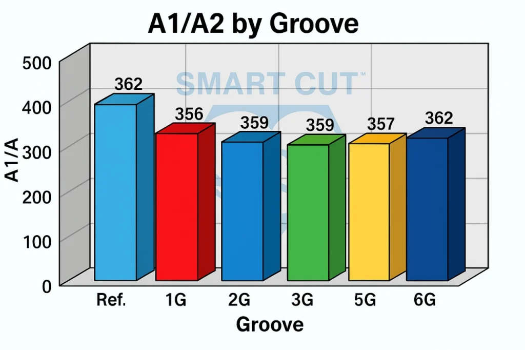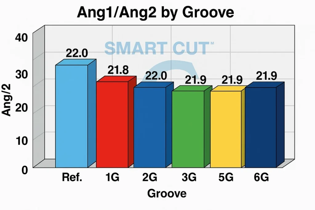 Angles (Ang1 and Ang2) All designs stayed between about 21.3 and 22.0 degrees. The bevel shape remained consistent No groove showed abnormal crit