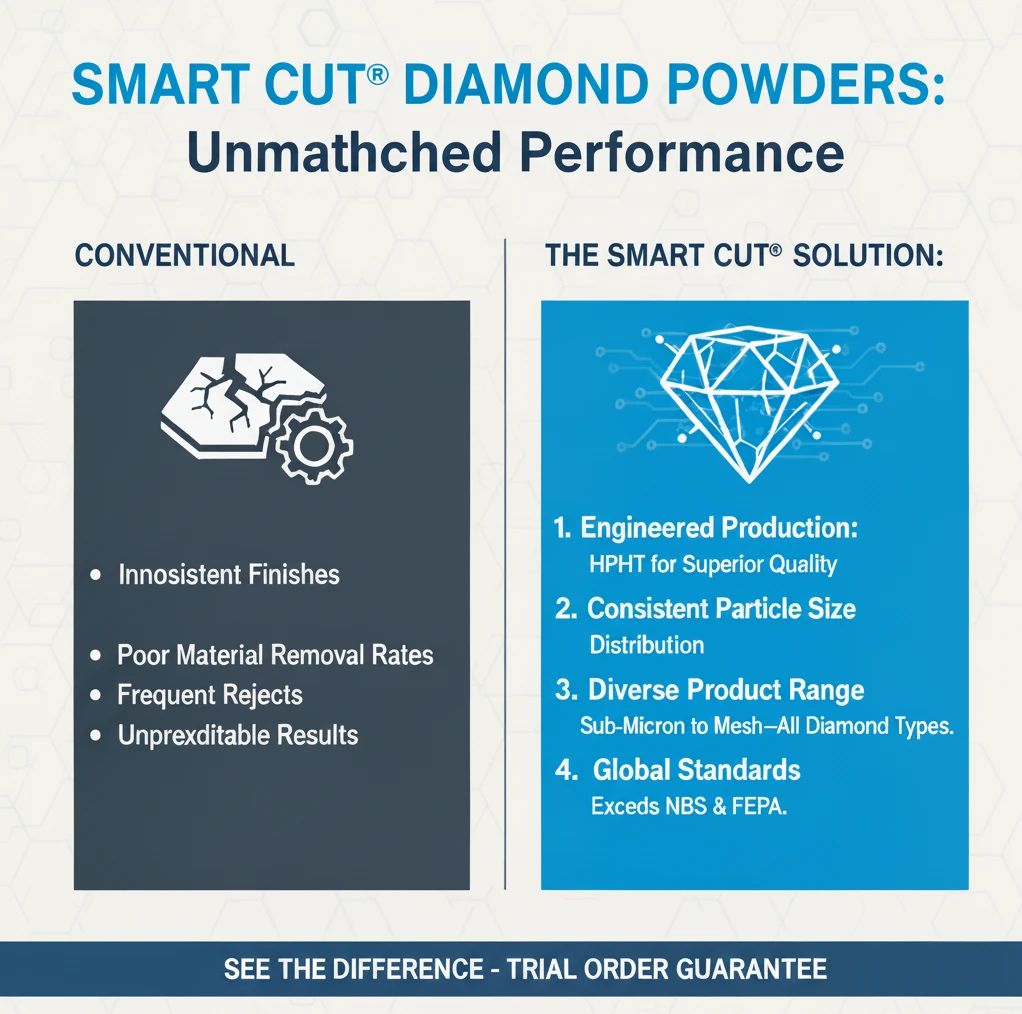 SMART CUT® Diamond Powder is meticulously engineered for lapping and polishing applications, produced under stringent high-pressure and high-temperature conditions. Each batch is rigorously graded to meet strict standards, ensuring an exceptional particle size distribution for each specified size. We provide both natural and synthetic diamond powder, available in monocrystalline, polycrystalline, and natural forms. Our range includes ultra-fine sub-micron sizes (as small as 1/10 micron) to more robust abrasive sizes of 80-120 microns, along with a comprehensive spectrum of mesh sizes for various diamond abrasives.
