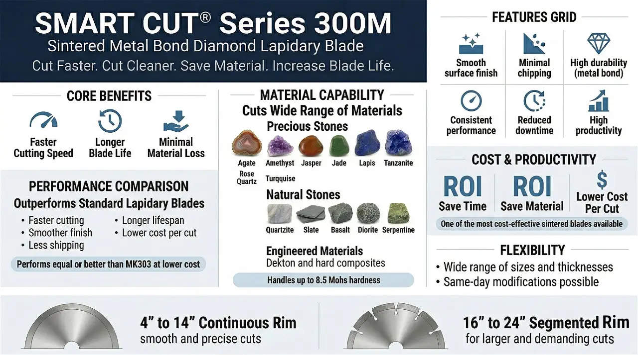 The SMART CUT Series 300M is a line of sintered (metal bonded) diamond lapidary blades designed for efficient cutting of materials such as sapphire, agate, emerald, ruby, opal, petrified wood, glass, and more.
