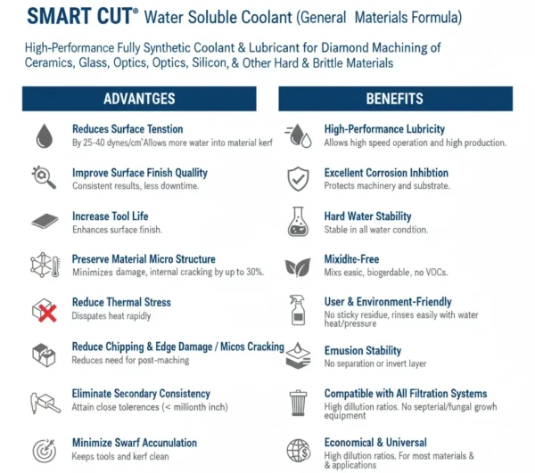 SMART CUT® Water Soluble Coolant (General Materials Formula) is a fully synthetic, non-oily, and non-foaming coolant and lubricant engineered to meet the rigorous demands of slicing, dicing, drilling, sectioning, wafering, grinding, and polishing operations involving hard and brittle materials. This advanced formula has been specifically developed for use with ceramics, precision optics, quartz, silicon, sapphire, and other materials commonly found in semiconductor, photonics, and materials research applications.