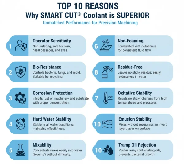 Designed to deliver measurable improvements in productivity and performance, SMART CUT® Water Soluble Coolant can improve cutting, drilling, grinding, & machining performance by 10% to 50% or more, depending on the material being processed, the type of tooling used, and the condition of the previous coolant. These improvements can include faster cutting speeds, reduced chipping and subsurface damage, longer tool life, and greater consistency across batches and setups.