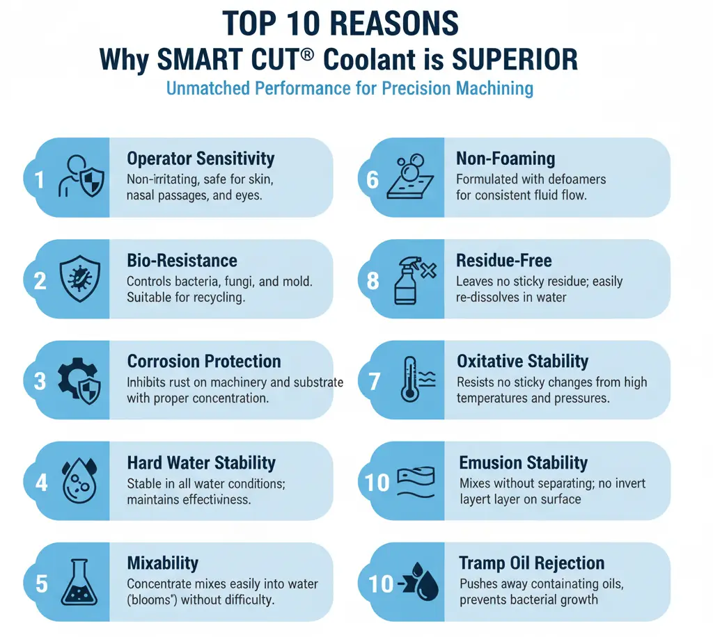 Operator- and environmentally-friendly, SMART CUT® Water Soluble Coolant contains no oils, silicones, or volatile organic compounds (VOCs). It is non-toxic, biodegradable, and completely water-soluble, making it ideal for use in clean rooms, research laboratories, and production environments where safety and cleanliness are critical. Unlike traditional oil-based coolants, it leaves no sticky residues and rinses off easily with water, reducing cleanup time and keeping equipment and work surfaces clean.
