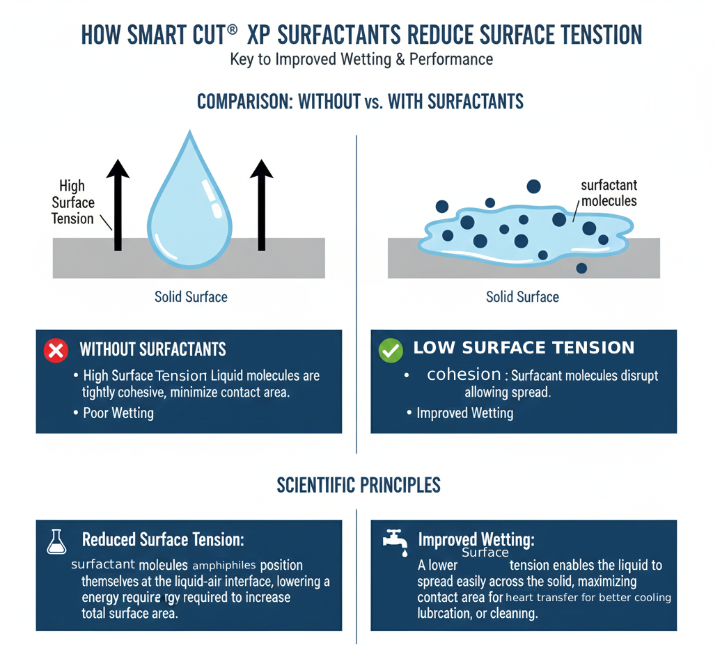 As a coolant, SMART CUT® XP KOOL reduces heat caused by friction. As a lubricant, SMART CUT® XP KOOL lowers friction and surface tension, which increases swarf dispersion.