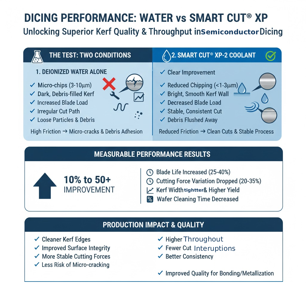 Using SMART CUT® XP Dicing Coolant / Lubricant significantly extended blade longevity, reduced tool wear, and improved cost efficiency in high-volume silicon wafer dicing applications.