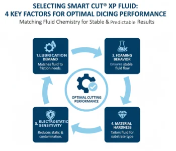 By effectively lubricating and cleaning the blade’s diamond matrix, SMART CUT® XP ensures the blade cuts freely and wears evenly, extending its lifespan and maintaining optimal cutting performance. As wafer sizes increase and dicing cycles lengthen, the role of an advanced lubricant like SMART CUT® XP becomes even more critical in maintaining efficiency and precision.