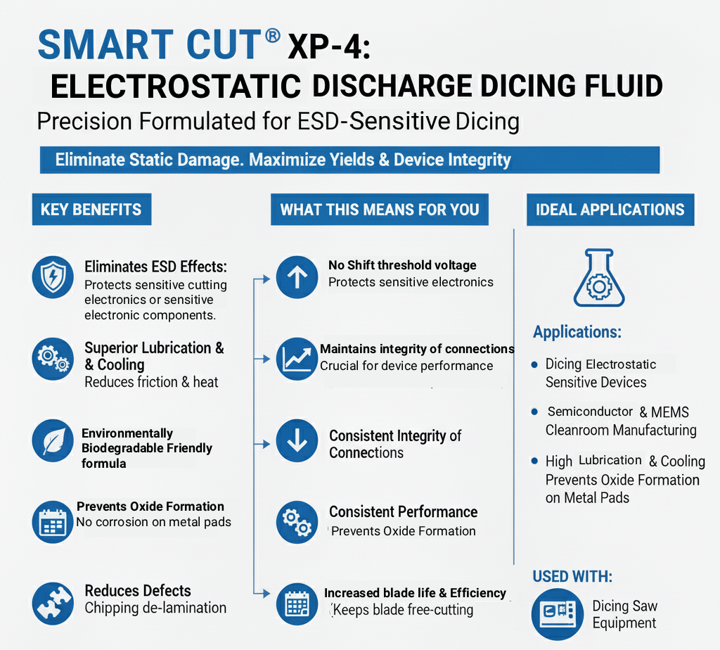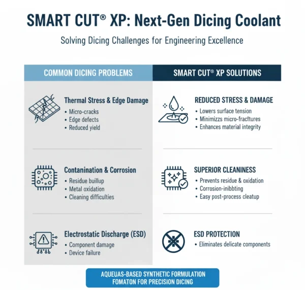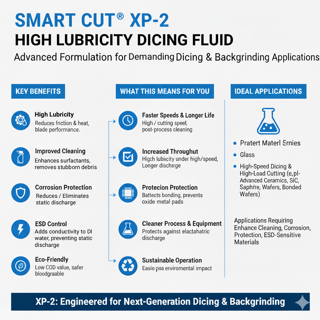 With its ability to support longer dicing cycles, maintain blade integrity, and provide superior surface cleanliness, SMART CUT® XP is an essential component in achieving high-quality, defect-free cuts in advanced semiconductor and electronic packaging applications.
