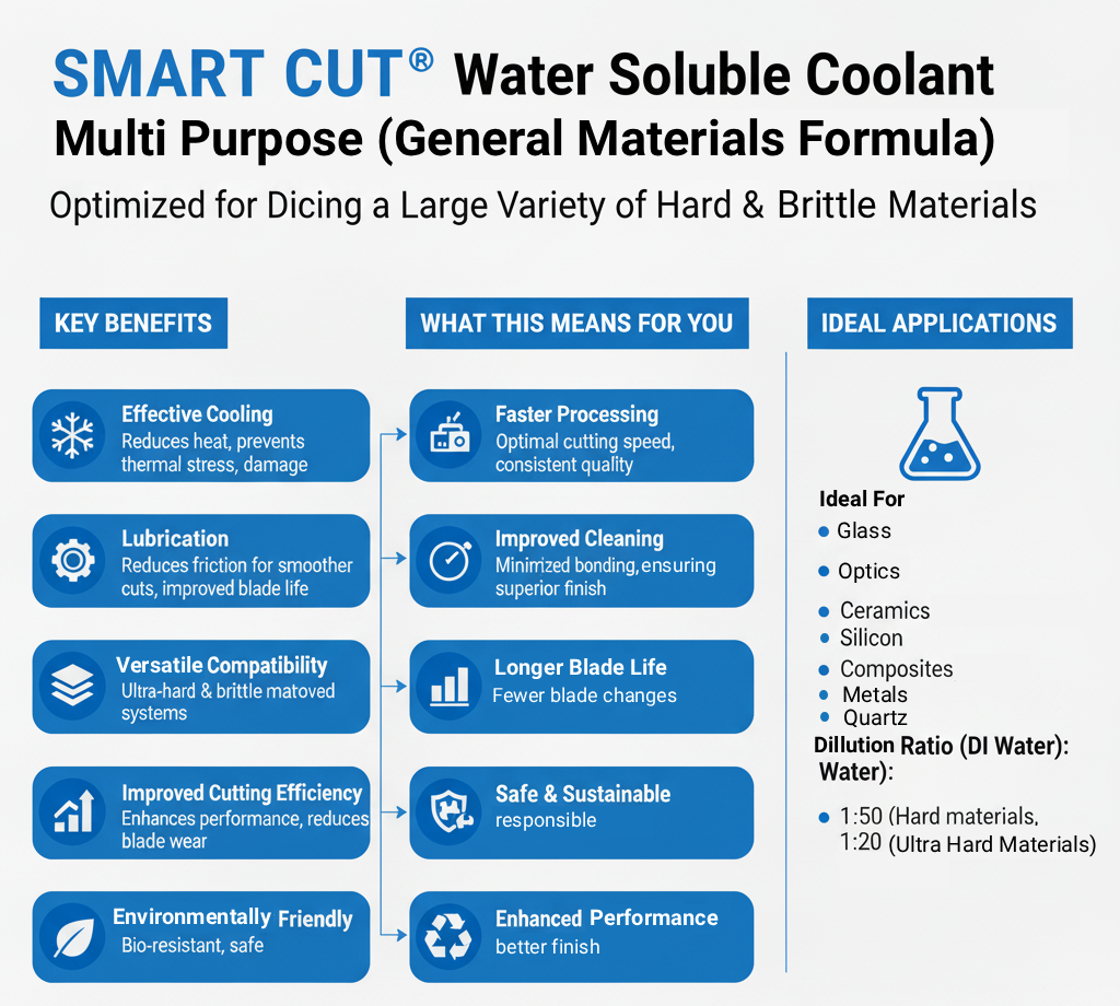 SMART CUT Coolant (General Materials Formula) - versatile, general-purpose coolant, used for dicing ultra hard and brittle materials such as ceramics, optics, quartz, silicon, and other hard materials.