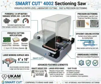 The SMART CUT™ 4002 is an entry-level lab cutting saw designed for fast and precise sectioning of materials like printed circuit boards, ceramic substrates, electronic packages, and other materials up to 1.0″ (25.4mm) in diameter.