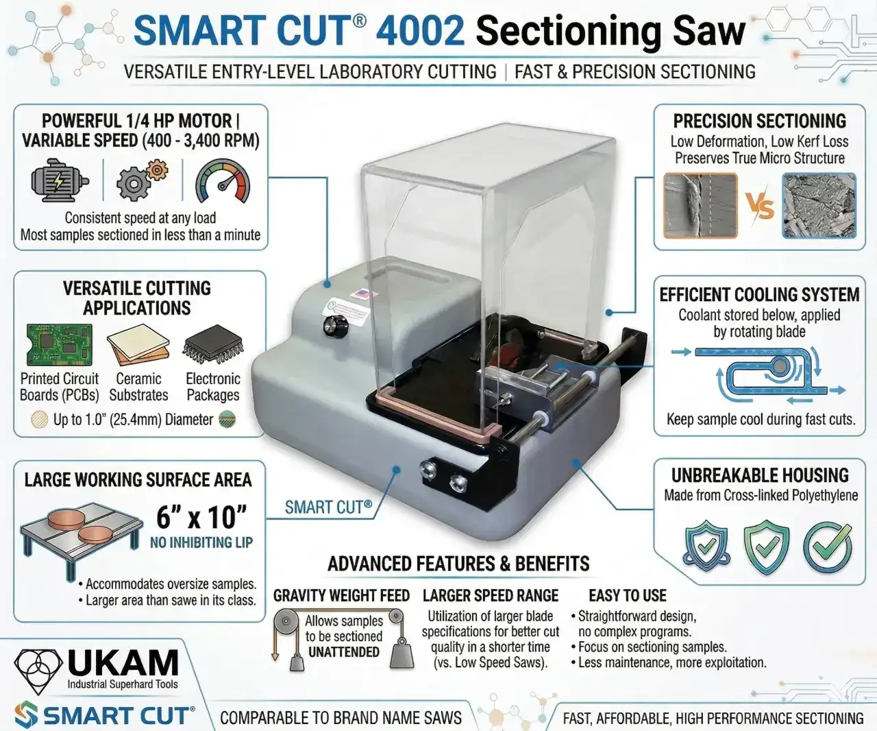 SMART CUT® 4002 is an versatile entry level laboratory cutting saw that is very affordably priced, Designed for Fast & Precision sectioning of printed circuit boards, ceramic substrates, electronic packages, and many other materials up to 1.0″ (25.4mm) in diameter. The saw has powerful 1/4 HP motor, running at variable speed of 400 to 3,400 RPM allow for most samples to be sectioned/cut in less then a minute.