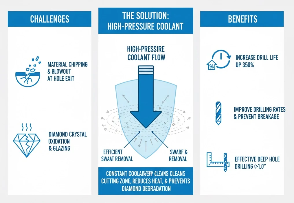 Ultra Hard Materials are very hard and dense. Highly optimized drilling parameters (not just the diamond drill itself) is required to be affective on these more challenging applications. Running high pressure of coolant through center of the drill right into the drilling zone has proven to be most effective method