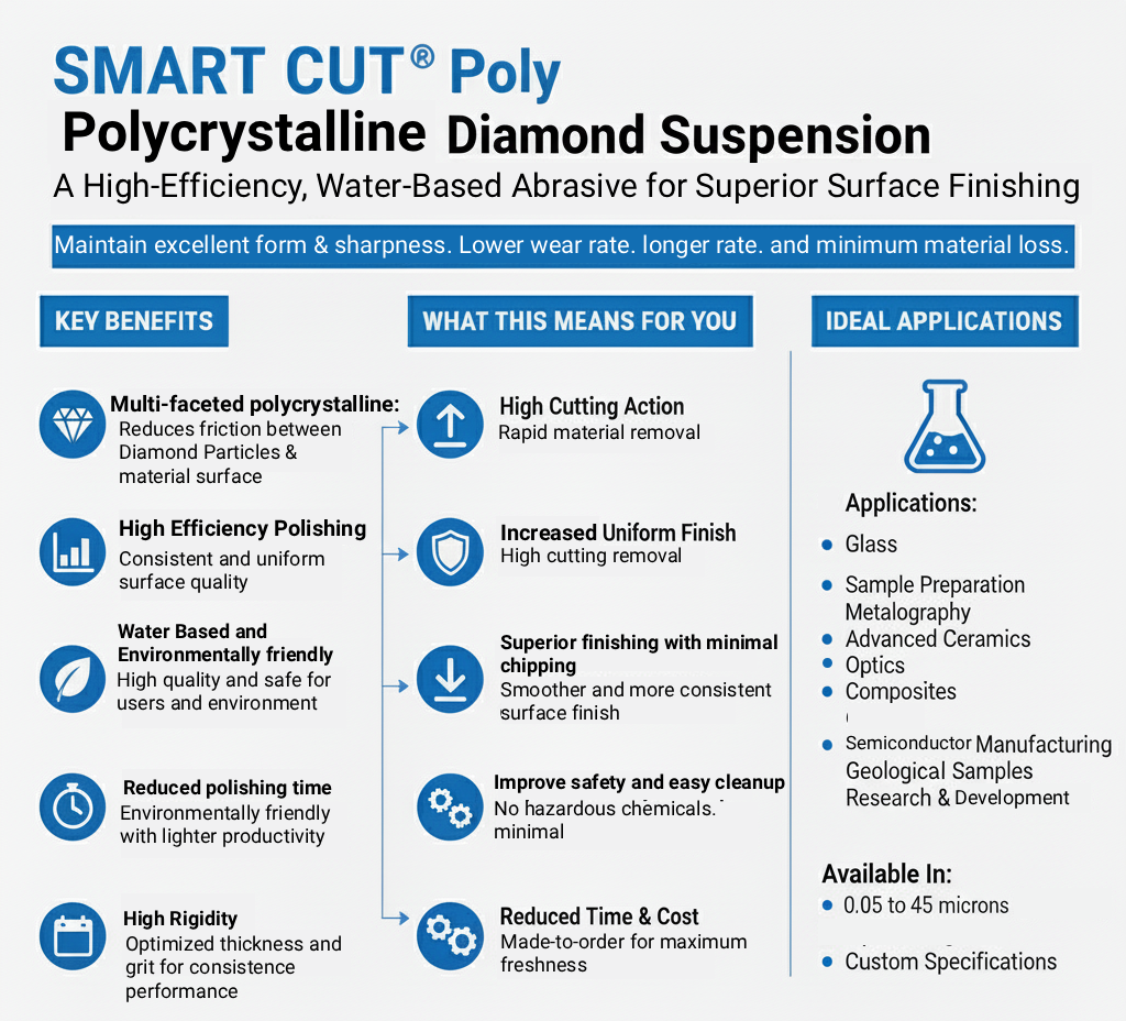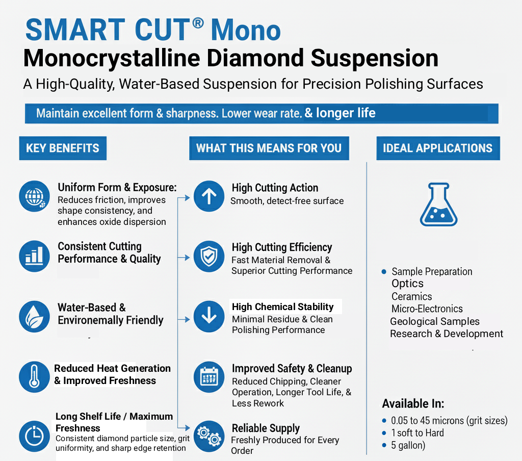 - Versatile applications across metallography, optics, advanced ceramics, composites, and semiconductor manufacturing