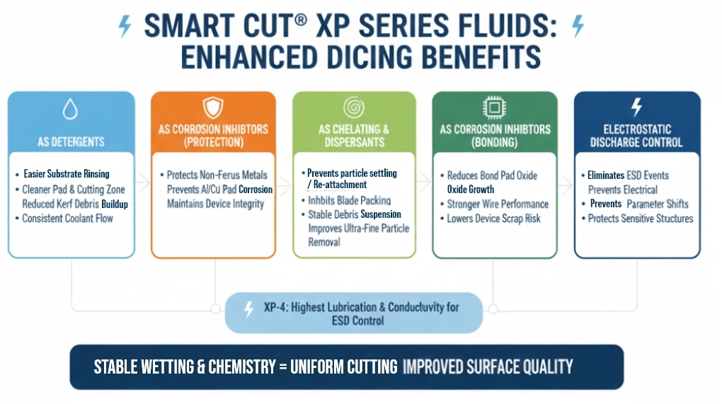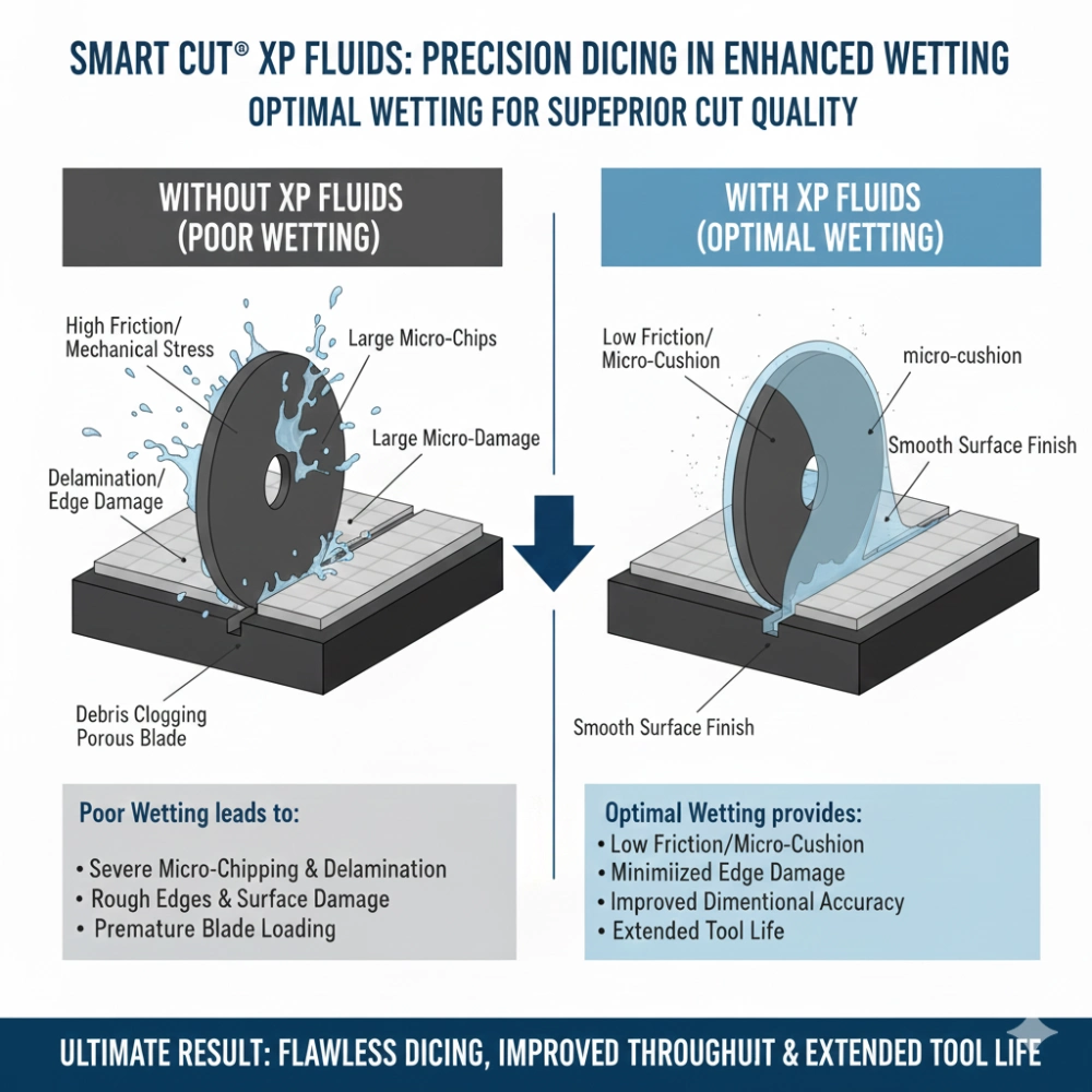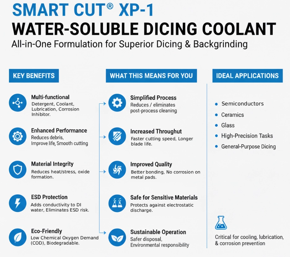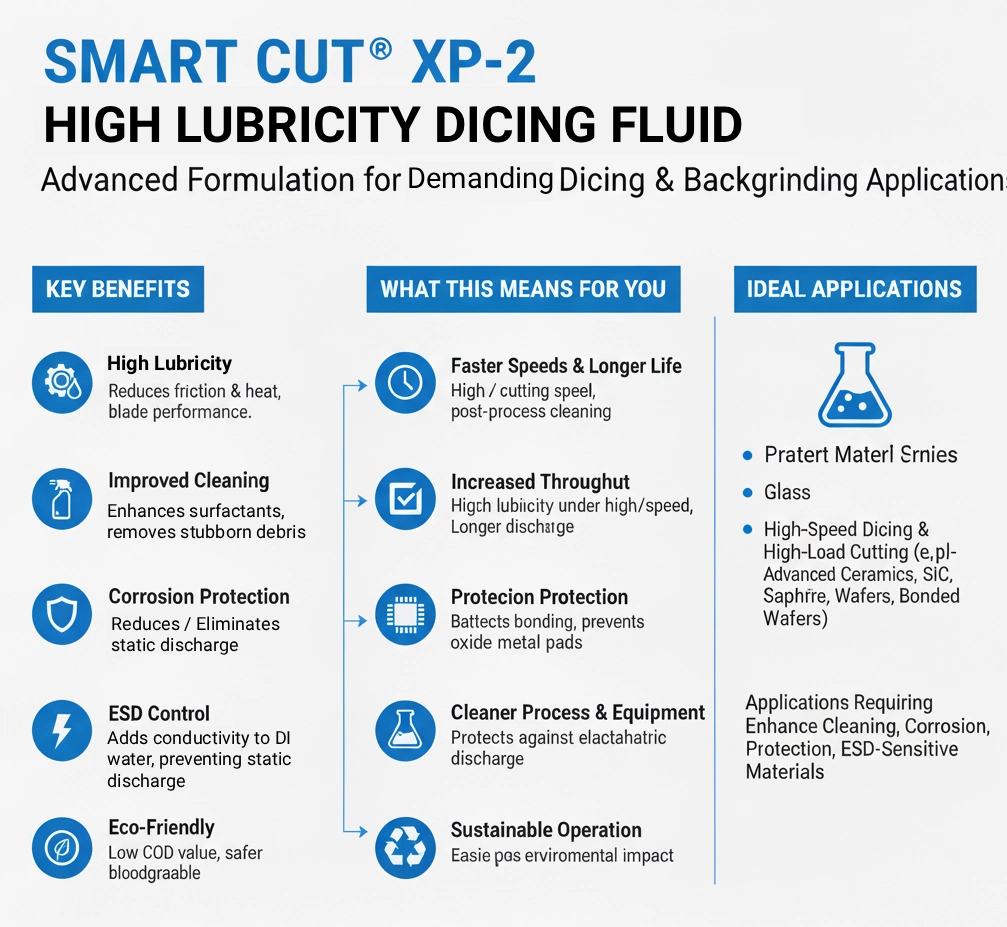 SMART CUT® XP Series fluids are advanced chemical formulations engineered for high precision wafer dicing, back-grinding, MEMS fabrication, optical processing, and advanced ceramic cutting. They enter the process through the saw coolant line and maintain stable performance throughout all stages of cutting and polishing. Each formulation combines the functions of detergent, corrosion inhibitor, chelating agent, and particle dispersant in a single balanced solution. This provides uniform wetting, cleaner blade interaction, and consistent cutting conditions at the blade interface.