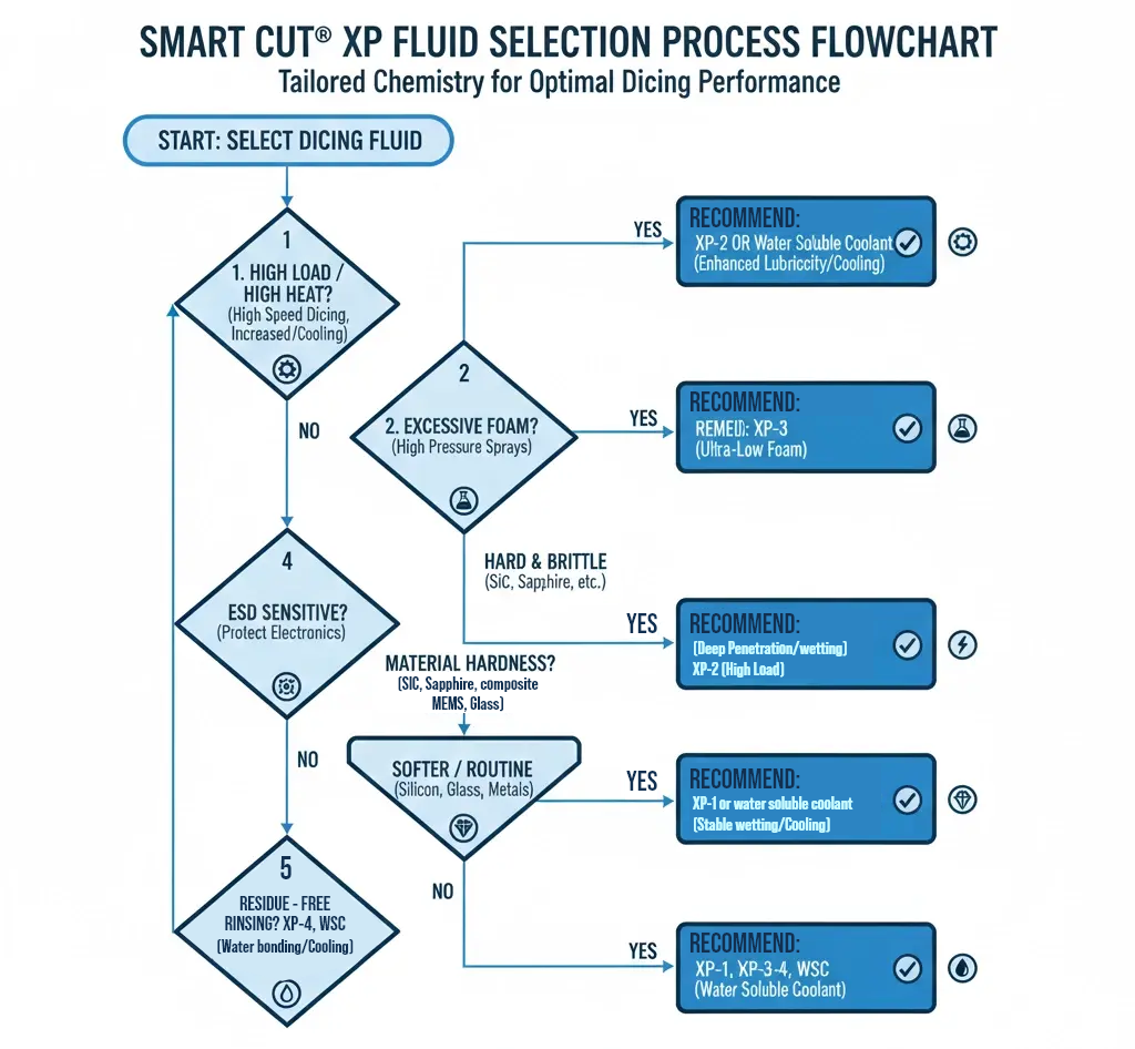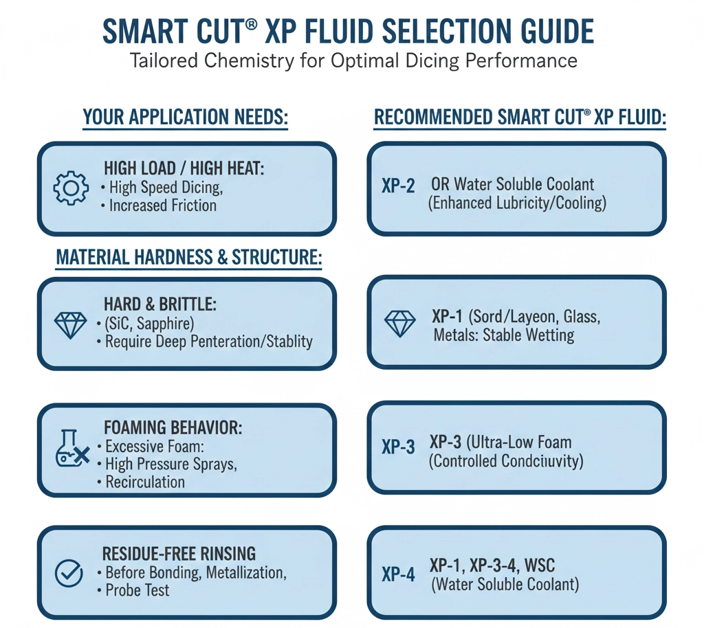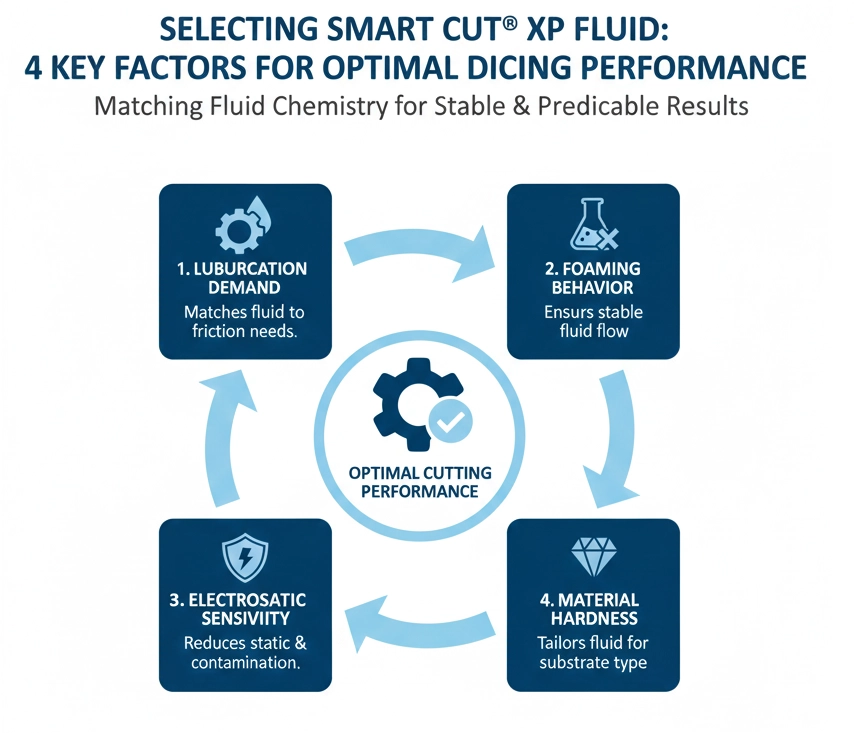 Selecting the correct dicing fluid requires a clear understanding of your cutting environment. Each operation places different demands on lubrication, foaming behavior, electrostatic control, and material stability. You should evaluate these factors before choosing the proper SMART CUT XP formulation.