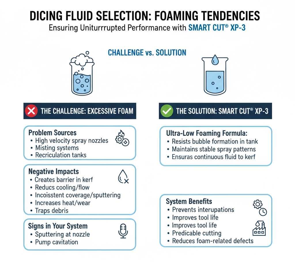 Foam also carries trapped debris. When foam collapses, this debris can fall back onto the wafer surface. This increases contamination and makes downstream cleaning more difficult. High foam levels can also interfere with sensors and fluid level controls in automated dicing equipment.