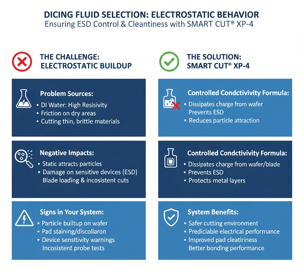Electrostatic behavior is another key factor when selecting a dicing fluid. DI water has very high resistivity. This means it does not conduct electrical charge. As a result, static builds up on the wafer surface, blade edge, and surrounding machine components during cutting. This buildup becomes stronger when cutting dry areas, thin structures, or brittle materials that generate friction. Without proper control, these charges accumulate to levels that can damage sensitive devices.