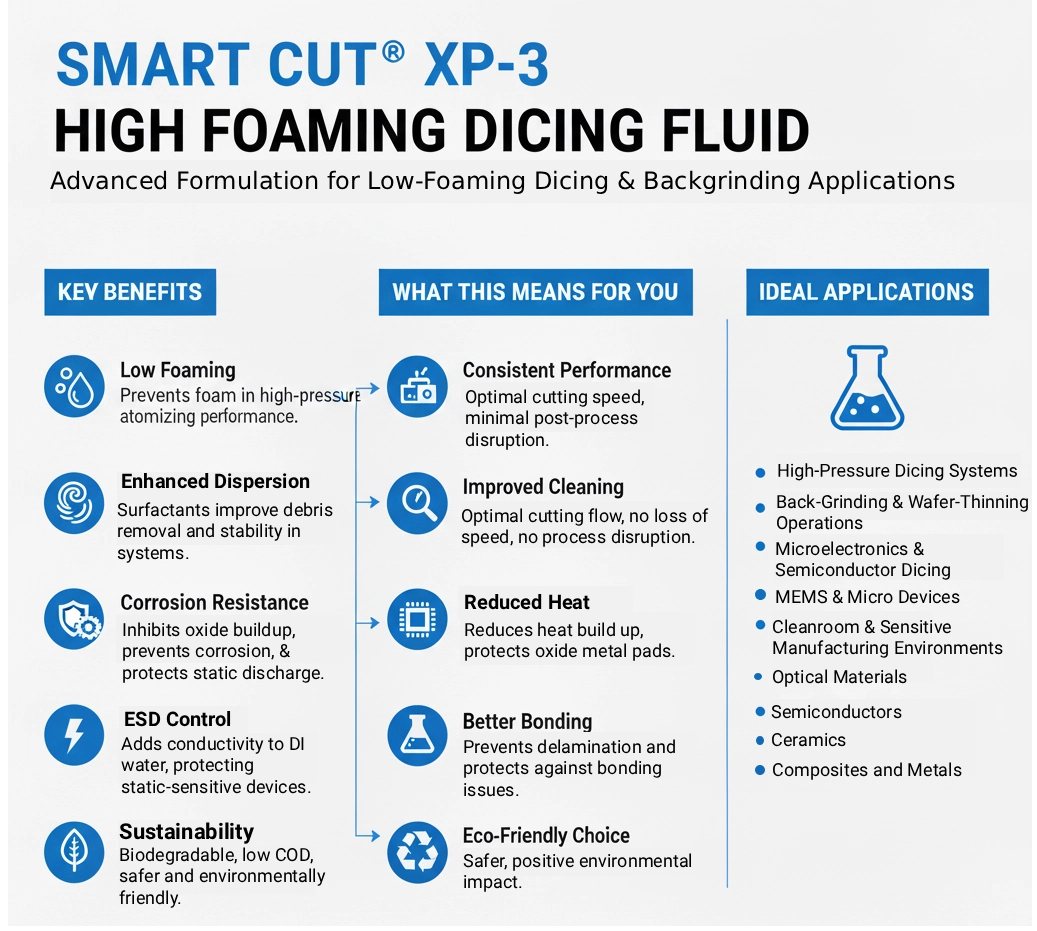 XP-3 is ideal for back-grinding systems and high-pressure dicing platforms that rely on atomizing or high-velocity coolant nozzles. It is suited for LOW-FOAM PRECISION DICING, microelectronics production, MEMS fabrication, and cleanroom operations where foam formation would impact accuracy or cleanliness. The formulation remains stable across wide variations in pressure, flow rate, and spray pattern, ensuring reliable performance during demanding, continuous operation.