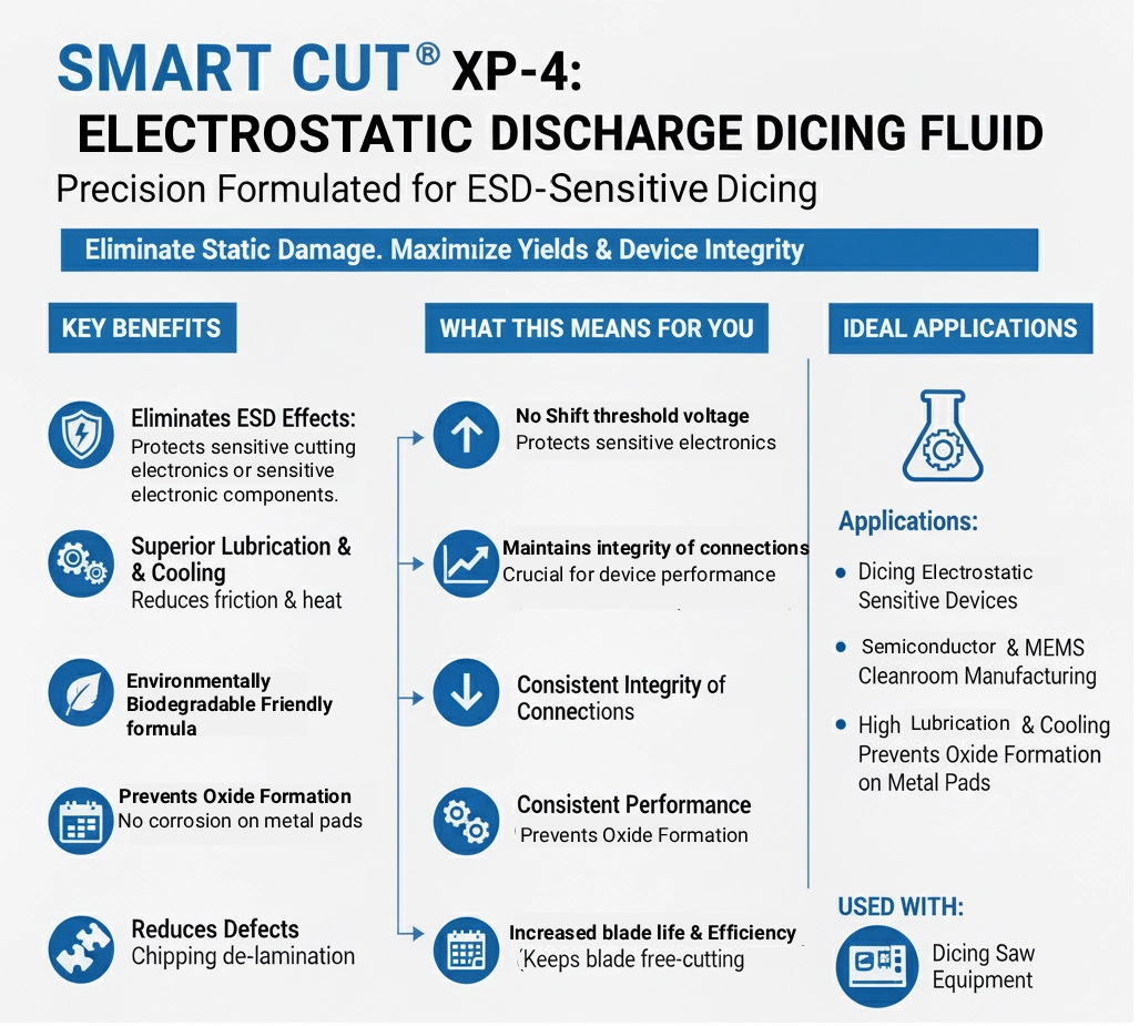 SMART CUT XP-4 is the dicing coolant developed specifically for applications where ELECTROSTATIC DISCHARGE (ESD) poses a serious risk to device integrity. The formulation provides FULL ESD SUPPRESSION, HIGH LUBRICITY, EFFECTIVE COOLING, and CORROSION PROTECTION, combining all critical performance functions into a single, stable fluid. XP-4 is intended for use with advanced semiconductor wafers, MEMS structures, and any device where static discharge during dicing could cause irreversible electrical or structural damage.