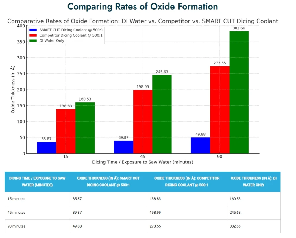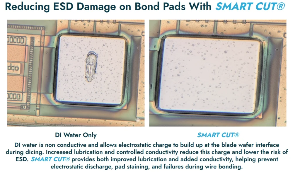 SMART CUT® XP fluids also increase the conductivity of DI water to help dissipate electrostatic charge before it accumulates to harmful levels. This reduces the risk of ESD at the blade and wafer interface, prevents shifts in threshold voltage, and minimizes electrical instability during downstream testing. Unlike CO₂ bubblers, the added conductivity does not introduce acids, avoiding corrosion or oxide growth associated with carbonic acid formation.
