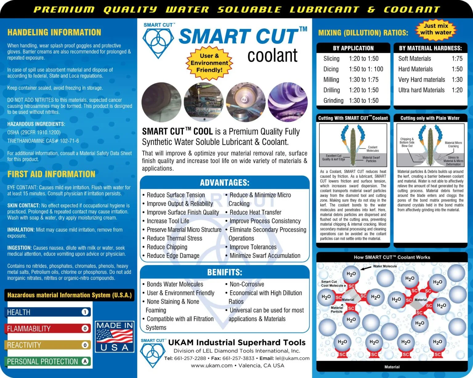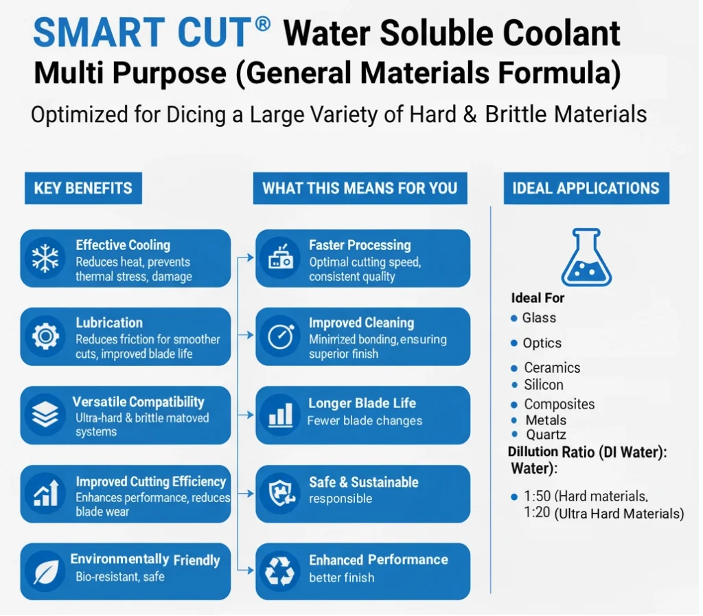 SMART CUT Coolant (General Materials Formula) – versatile, general-purpose coolant, used for dicing ultra hard and brittle materials such as ceramics, optics, quartz, silicon, and other hard materials.