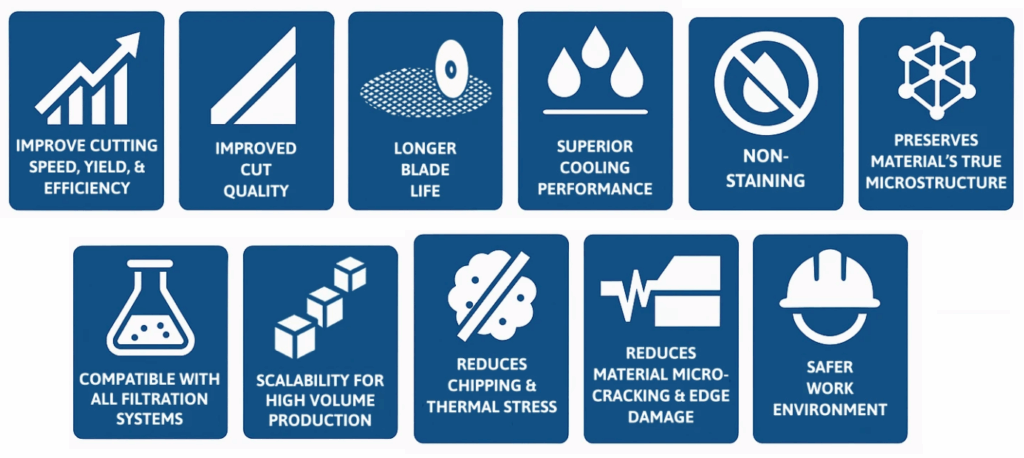 These conditions require a fluid with enhanced lubricity to reduce drag on the blade and maintain a smooth cutting path. A high lubricity fluid allows the diamond edge to engage the material cleanly. It limits friction spikes and prevents sudden changes in cutting pressure. It also helps preserve blade geometry, which is essential for maintaining narrow kerf widths and uniform edge quality across long production runs.