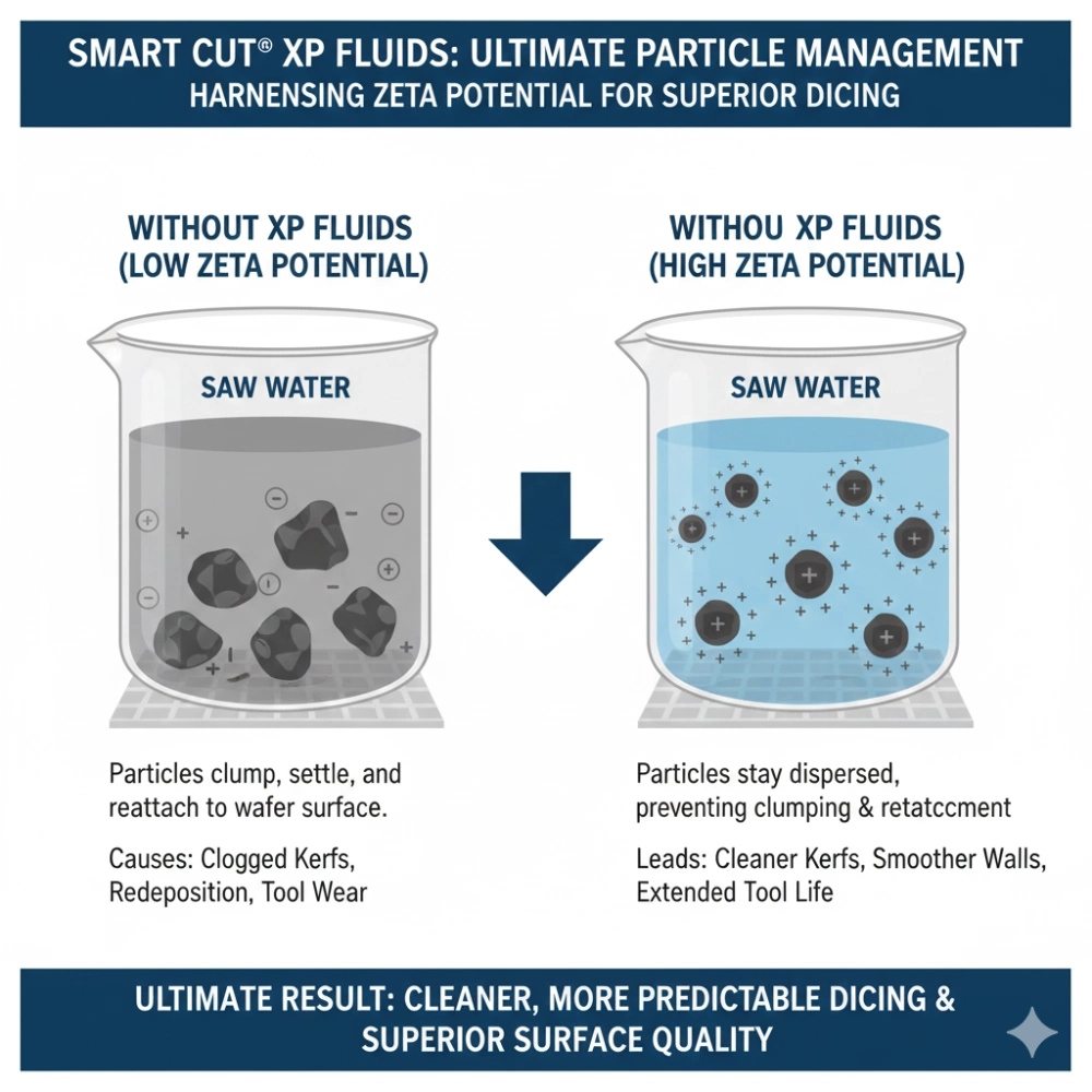 SMART CUT® XP fluids raise the zeta potential of particles suspended in saw water, which increases the natural repulsion between particles. When the zeta potential is high, debris stays dispersed instead of clumping, settling, or reattaching to the wafer surface.
